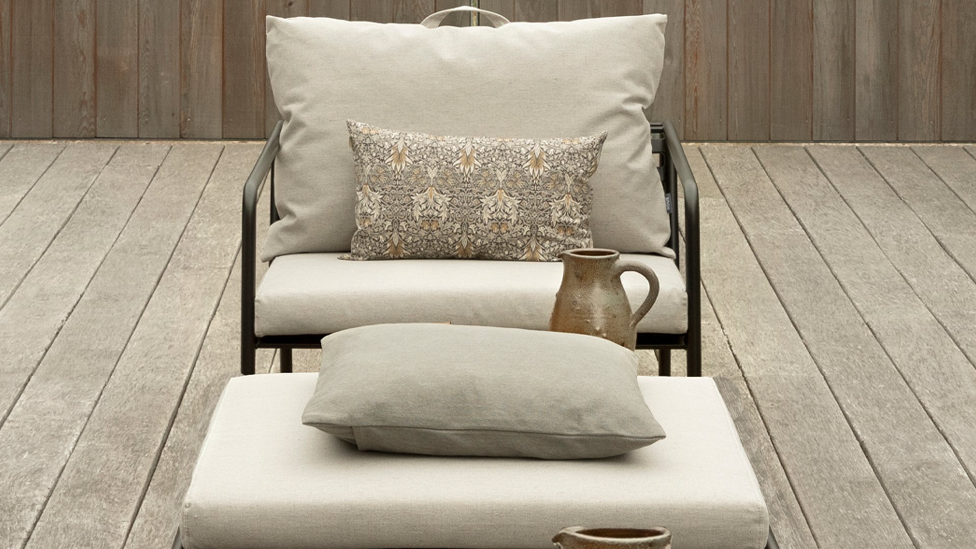 Wasser fließt direkt durch den speziellen Schaum hindurch, während ein weiteres Material, Dacron, dafür sorgt, dass die Kissen ihre originale Form behalten. Die Polster sind ausziehbar und waschbar. Die Kissen HOUE AVON bestehen aus Sunbrella Heritage-Stoff, der zu 50 % aus recyceltem Acryl besteht. Bunte Faserenden aus dem Prozess der Wiederverwendung des Primärmaterials können im Gewebe erscheinen und die Stofffarbe von einer Charge zur anderen variieren. So entsteht ein einzigartiger Stoff mit natürlichem Look und Vintage-Charme. Der Stoff ist Oeko-Tex-zertifiziert, wasserabweisend, schmutzabweisend und pflegeleicht.