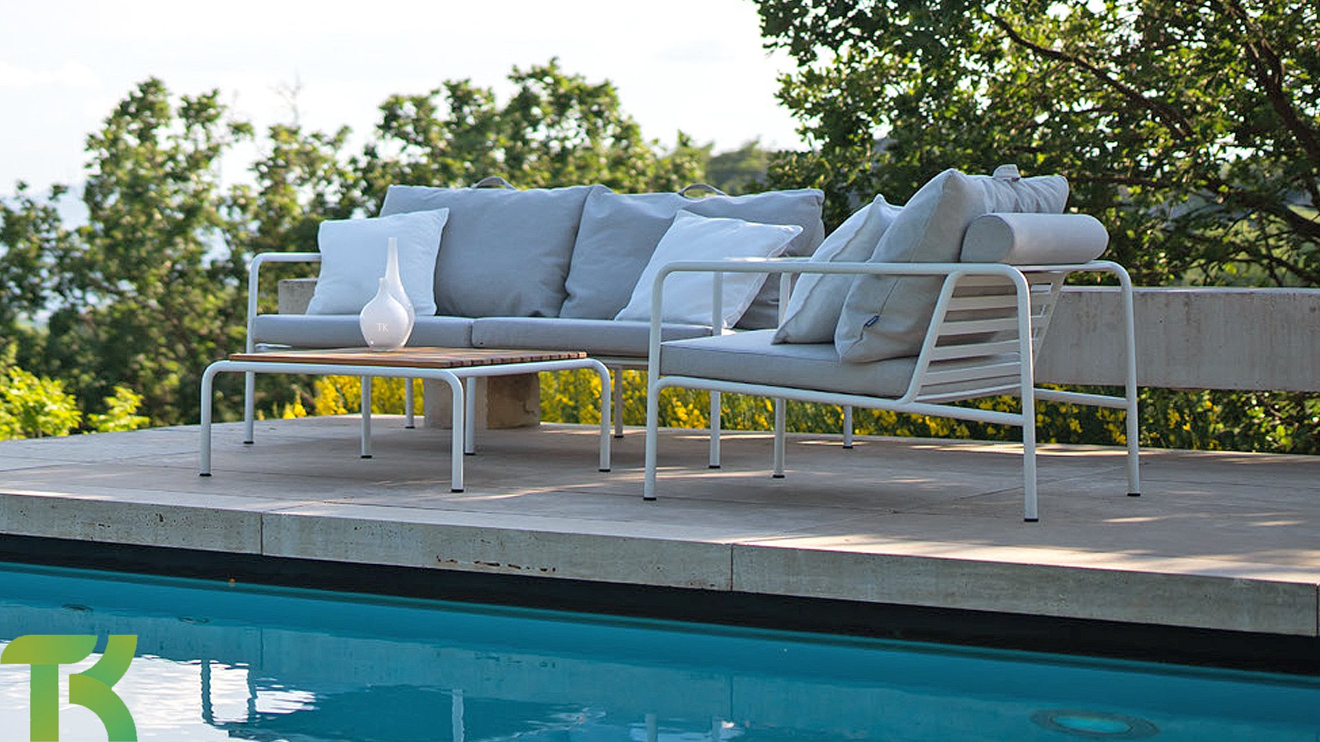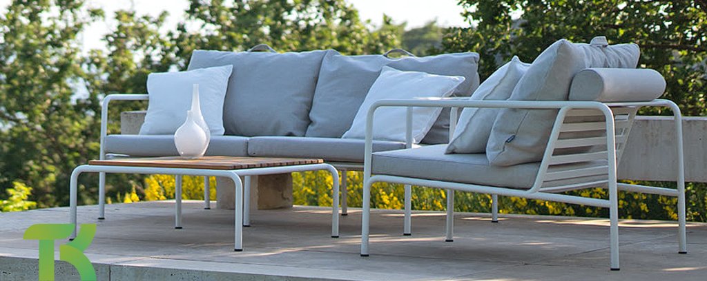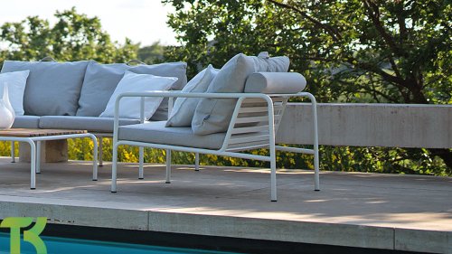 Der wartungsfreie Pulverbeschichteter Rahmen und die Konstruktion der großen weichen Rückenkissen sind genau das - die Einfachheit der Struktur, bei der niedrige Linien dafür sorgen, dass das Design sowohl mit als auch ohne Kissen immer stolz erscheint - Sommer oder Winter. Die Griffe der Kissen sind eine Aussage über die Funktion des Produkts und machen sie bei Bedarf leicht zu greifen und aufzubewahren.