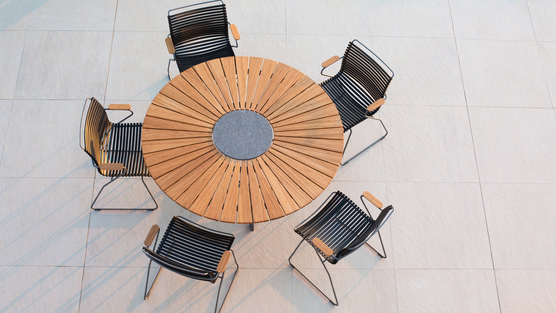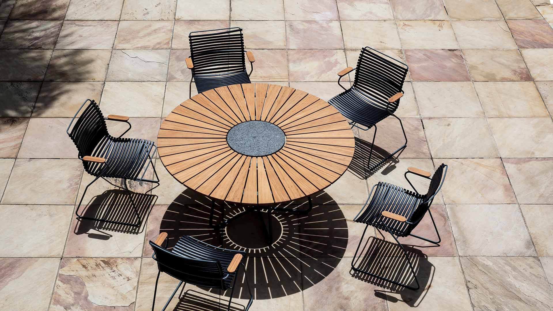 Der Houe Circle ist ein runder Gartentisch mit einer schönen Platte aus gemischtem Bambus. Den Kreis gibt es in 2 Größen, nämlich 150cm und 110cm. Das Schöne an diesem runden Tisch ist, dass er viel Platz bietet. In der Mitte des Kreistisches befindet sich ein zusammengesetzter Stein. Dies ist nützlich, wenn Sie Ihre heißen Pfannen usw. Das skandinavische Design in Kombination mit dem nachhaltigen Bambus sorgt dafür, dass dieser Tisch in jedem Garten gut zur Geltung kommt. Bambus ist eine schnell wachsende Pflanze und daher wesentlich nachhaltiger als Teak. Wir empfehlen den Tisch 2-3 mal im Jahr zu ölen. Wenn der Tisch gut gepflegt wird, hält er sehr lange und behält seine schönen Farben.