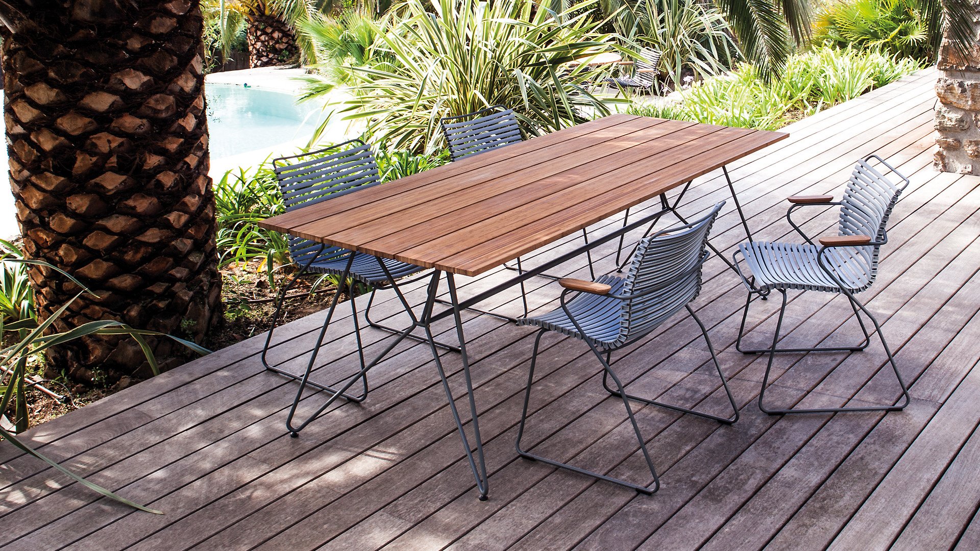 Houe Sketch Gartentisch mit Bambusplatte. Dieser wunderschöne minimalistische Gartentisch der dänischen Designmarke Houe ist in 2 Längen erhältlich: 160 cm und 220 cm. Das Gestell besteht aus Stahl in Kombination mit einer speziellen Pulverbeschichtung, die den Tisch für den Außenbereich geeignet macht. Dieser Tisch passt perfekt zu den Click Dining Gartenstühlen von Houe, das Gestell hat die gleiche Farbe wie das Gestell der Stühle. Da Bambus viel schneller wächst, ist er eine nachhaltige Alternative zu Teak. Bambus sollte 2-3 mal im Jahr geölt werden, dann behält er seine schöne warme Farbe.