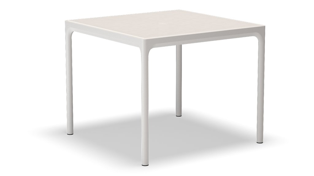 Der Houe Four Tisch ist ein robustes Modell, das sich ideal für industrielle oder rustikale Interieurs eignet. Er ist wetterfest und verfügt über ein stabiles Aluminiumgestell, das in den pulverbeschichteten Farben Black, Olive Green oder Muted White erhältlich ist. Der 90 x 90 cm große Tisch ist mit einer Öffnung für einen Sonnenschirm ausgestattet.