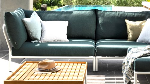 Wasser fließt direkt durch den speziellen Schaum hindurch, während ein weiteres Material, Dacron, dafür sorgt, dass die Kissen ihre originale Form behalten. Die Polster sind ausziehbar und waschbar. Die Kissen in der Lounge sind mit einem speziellen Outdoor-Stoff mit einer Basis aus Quickdry-Schaum versehen. Dadurch sind die Kissen in kürzester Zeit wieder trocken und es bildet sich kein Schimmel. Die Stoffe sind leicht mit einem milden Reinigungsmittel zu reinigen. Die Kissen sind abnehmbar und bei 30 Grad waschbar. Die Kissen in Alpengrün und Esche in Hellgrau / Ecru-Farbe und die Char Farbe bestehen aus Sunbrella Heritage-Material, das zu 50% aus recyceltem Acryl besteht. Bunte Faserenden aus dem Recycling des Primärmaterials können im Stoff auftreten und die Stofffarbe von Charge zu Charge variieren. Dadurch entsteht ein einzigartiger Stoff mit natürlichem Aussehen und Vintage-Charme. Der Stoff ist Oeko-tex-zertifiziert, wasserabweisend, schmutzabweisend und wartungsfreundlich.