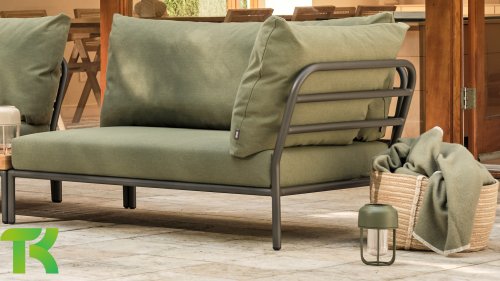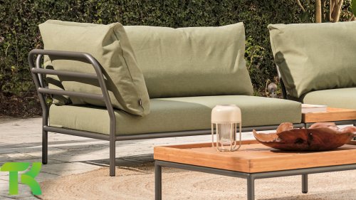 Wasser fließt direkt durch den speziellen Schaum hindurch, während ein weiteres Material, Dacron, dafür sorgt, dass die Kissen ihre originale Form behalten. Die Polster sind ausziehbar und waschbar. Die Kissen in der Lounge sind mit einem speziellen Outdoor-Stoff mit einer Basis aus Quickdry-Schaum versehen. Dadurch sind die Kissen in kürzester Zeit wieder trocken und es bildet sich kein Schimmel. Die Stoffe sind leicht mit einem milden Reinigungsmittel zu reinigen. Die Kissen sind abnehmbar und bei 30 Grad waschbar.Die Kissen in Alpengrün und Esche in Hellgrau / Ecru-Farbe die Char Farbe bestehen aus Sunbrella Heritage-Material, das zu 50% aus recyceltem Acryl besteht. Bunte Faserenden aus dem Recycling des Primärmaterials können im Stoff auftreten und die Stofffarbe von Charge zu Charge variieren. Dadurch entsteht ein einzigartiger Stoff mit natürlichem Aussehen und Vintage-Charme. Der Stoff ist Oeko-tex-zertifiziert, wasserabweisend, schmutzabweisend und wartungsfreundlich.
