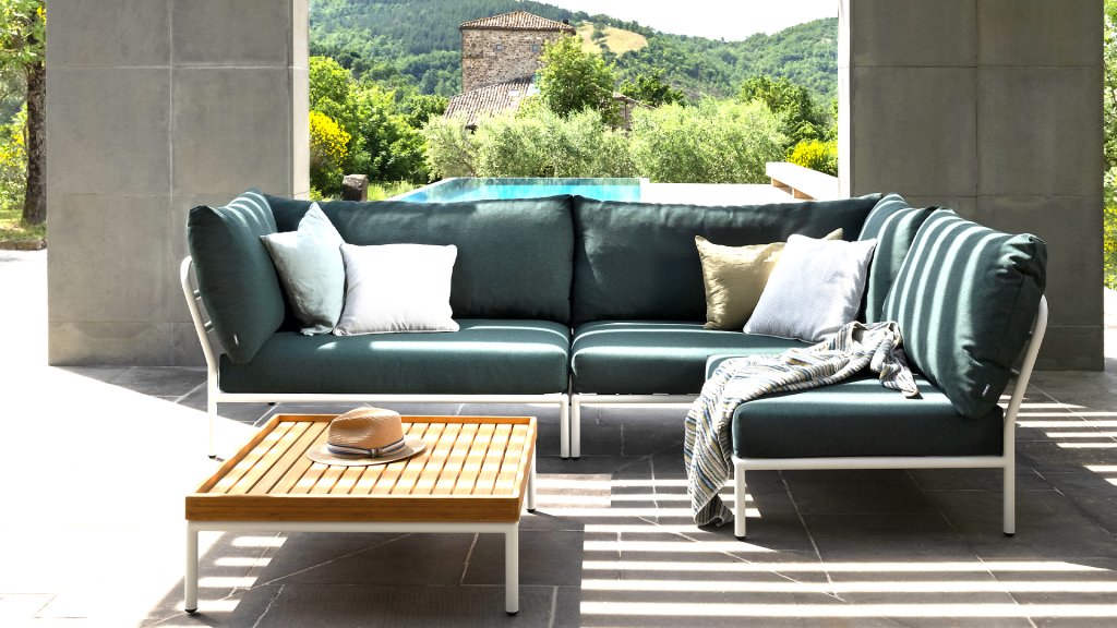 Wasser fließt direkt durch den speziellen Schaum hindurch, während ein weiteres Material, Dacron, dafür sorgt, dass die Kissen ihre originale Form behalten. Die Polster sind ausziehbar und waschbar. Die Kissen in der Lounge sind mit einem speziellen Outdoor-Stoff mit einer Basis aus Quickdry-Schaum versehen. Dadurch sind die Kissen in kürzester Zeit wieder trocken und es bildet sich kein Schimmel. Die Stoffe sind leicht mit einem milden Reinigungsmittel zu reinigen. Die Kissen sind abnehmbar und bei 30 Grad waschbar.Die Kissen in Alpengrün und Esche in Hellgrau / Ecru-Farbe die Char Farbe bestehen aus Sunbrella Heritage-Material, das zu 50% aus recyceltem Acryl besteht. Bunte Faserenden aus dem Recycling des Primärmaterials können im Stoff auftreten und die Stofffarbe von Charge zu Charge variieren. Dadurch entsteht ein einzigartiger Stoff mit natürlichem Aussehen und Vintage-Charme. Der Stoff ist Oeko-tex-zertifiziert, wasserabweisend, schmutzabweisend und wartungsfreundlich.