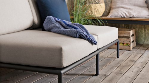 Die Level Lounge besteht aus verschiedenen Elementen, die viele Kombinationen ermöglichen. Der Lounge-Rahmen besteht aus Aluminium und ist hervorragend pulverbeschichtet. Die Kissen in der Lounge sind mit einem speziellen Outdoor-Stoff mit einer Basis aus Quickdry-Schaum versehen. Dadurch sind die Kissen in kürzester Zeit wieder trocken und es bildet sich kein Schimmel. Die Stoffe sind leicht mit einem milden Reinigungsmittel zu reinigen. Die Kissen sind abnehmbar und bei 30 Grad waschbar. Die Kissen in Alpengrün und Esche in Hellgrau / Ecru-Farbe bestehen aus Sunbrella Heritage-Material, das zu 50% aus recyceltem Acryl besteht. Bunte Faserenden aus dem Recycling des Primärmaterials können im Stoff auftreten und die Stofffarbe von Charge zu Charge variieren. Dadurch entsteht ein einzigartiger Stoff mit natürlichem Aussehen und Vintage-Charme. Der Stoff ist Oeko-tex-zertifiziert, wasserabweisend, schmutzabweisend und wartungsfreundlich.