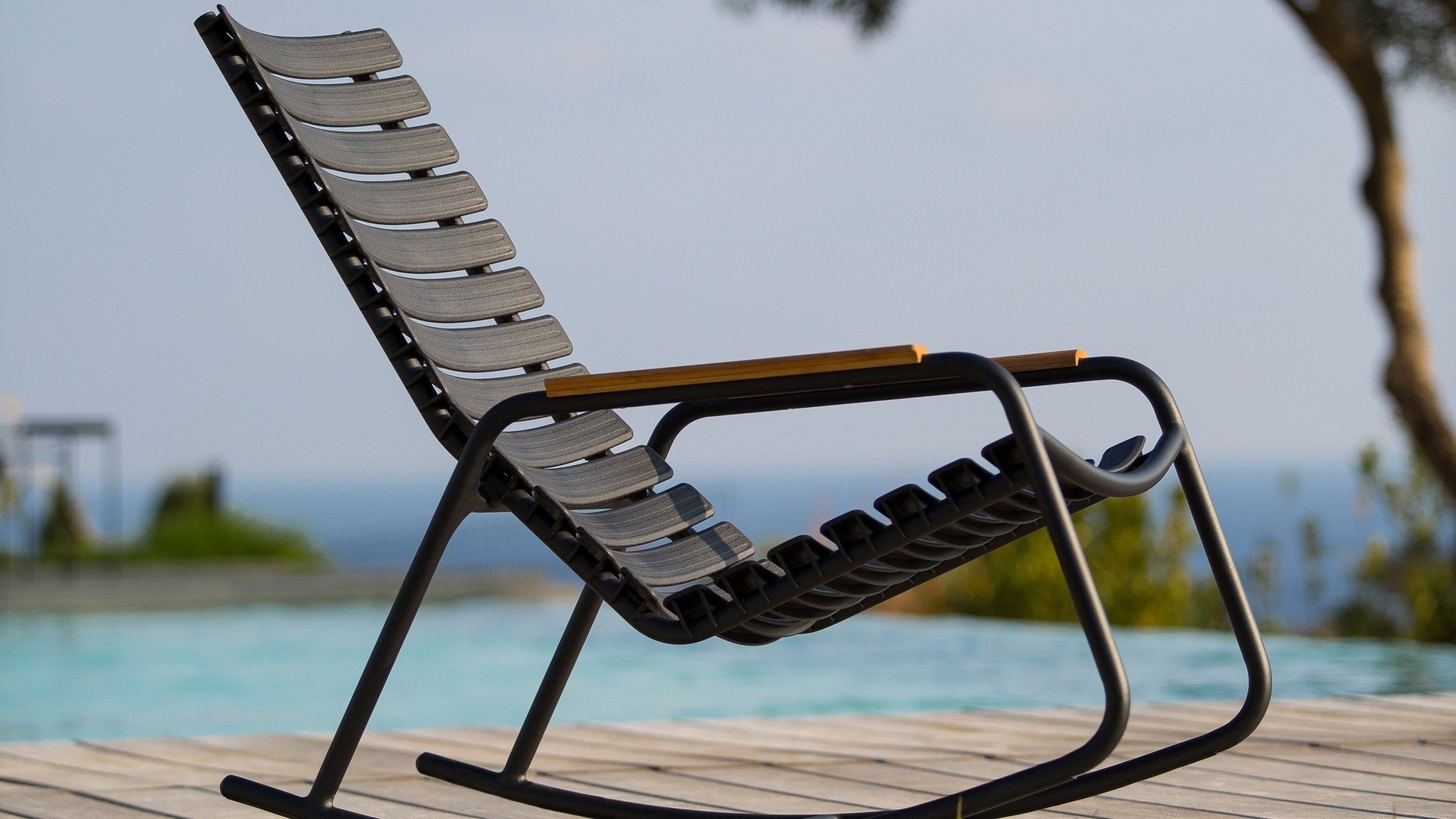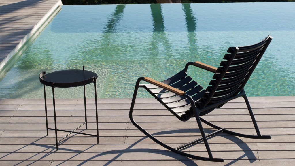 Die HOUE Reclips-Serie besteht aus recyceltem Kunststoff. In Kombination mit dem pulverbeschichteten Aluminiumrahmen ist dies ein pflegefreier Loungesessel. Die ergonomisch geformte Rückenlehne macht den Stuhl sehr komfortabel zu verwenden, ohne Kissen. In dieser Serie sind auch ein Barhocker, Gartenstuhl und ein Schaukelstuhl erhältlich.