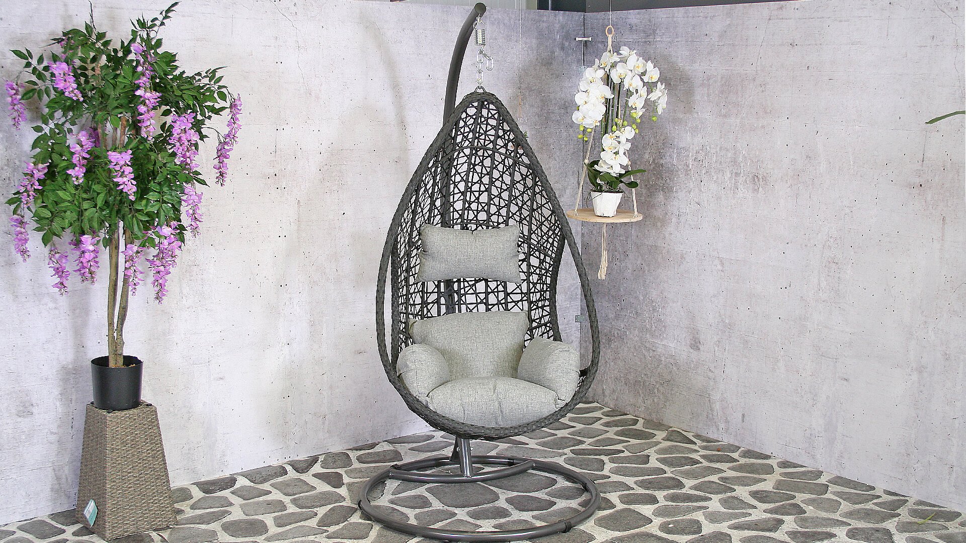 Dank des Ständers können Sie den Sessel problemlos verschieben und überall im Garten platzieren, im Schatten, in der Sonne, auf der Veranda oder auf Ihrer Terrasse. Das Ei können Sie durch eine stählerne Kette höher oder niedriger hängen.