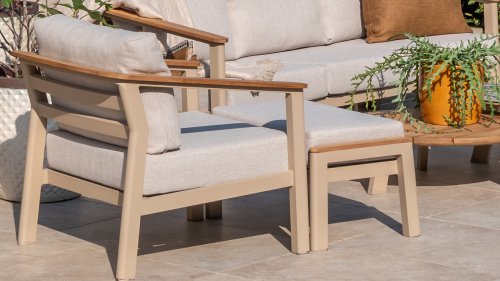 Die Latte-Farbe lässt sich wunderbar mit Teakholz kombinieren, daher wurde eine Teakholz-Veredelung gewählt. Die Armlehnen verlaufen bis zur Rückseite des Rahmens.