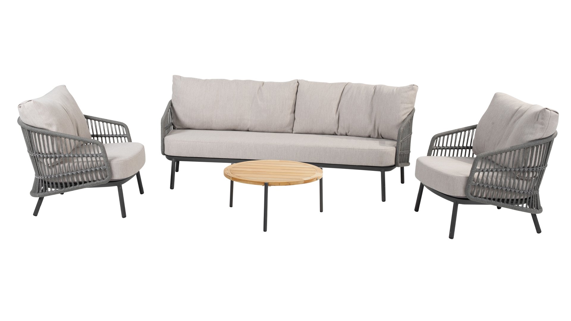 Materialien von höchster Qualität: ein robustes Rope- und Aluminiumgestell, kombiniert mit langlebigen Allwetterkissen, die jeder Saison mühelos standhalten.