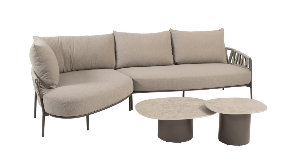 Verleihen Sie Ihrem Garten oder Ihrer Terrasse mit dem Calma Lounge-Set der niederländischen Qualitätsmarke Taste by 4 Seasons Ruhe und Stil. Der Name Calma spiegelt perfekt das Gefühl wider, das dieses Set vermittelt: Entspannung, Komfort und Harmonie. Das Terre-farbene Aluminiumgestell in Kombination mit der graufarbenen Seilstruktur( Rope)  an Rückenlehne und Seitenwänden schafft einen warmen und modernen Look und verwandelt Ihren Garten in eine wahre Wohlfühloase. Das Calma Lounge-Set bietet hervorragenden Sitzkomfort, ideal für lange Sommerabende, entspannte Momente mit einem Buch oder gemütliche Treffen mit Familie und Freunden. Zusätzlich zum Lounge-Set ist die Calma-Serie auch mit einem passenden Calma Esszimmerstuhl erhältlich, sodass Sie Ihren gesamten Außenbereich einheitlich gestalten können. Mit dem Calma Lounge-Set vereinen Sie Stil, Komfort und Langlebigkeit. Das taupefarbene Seil und das Latte-farbene Gestell ergeben zusammen eine ruhige, natürliche Farbkombination, die perfekt zum Namen Calma passt. Schaffen Sie sich Ihr eigenes Outdoor-Paradies und genießen Sie jeden Moment in höchstem Komfort.