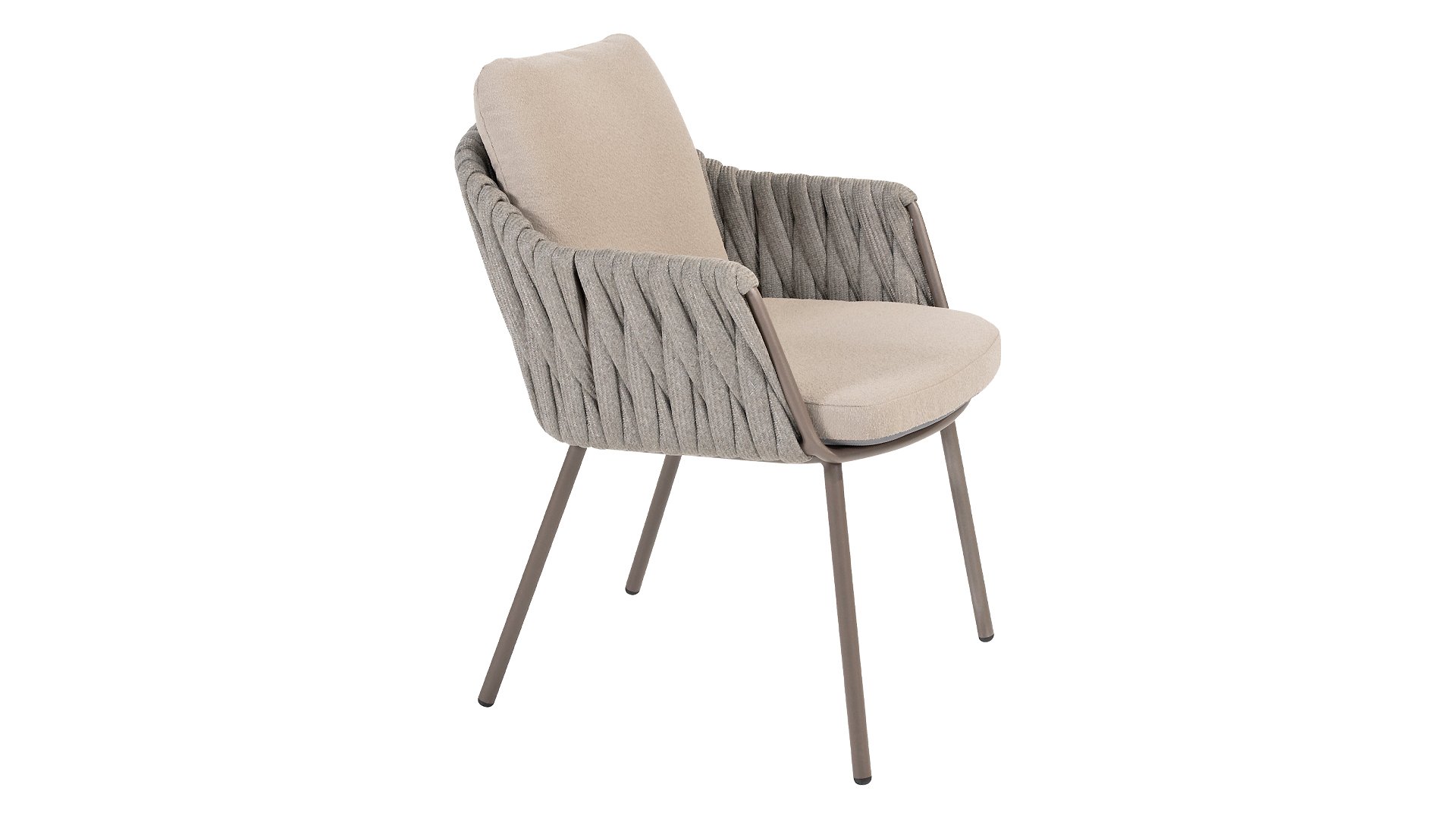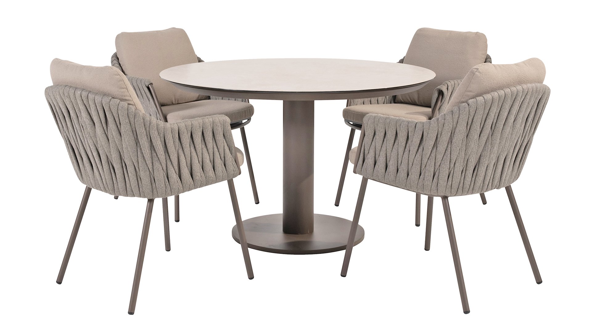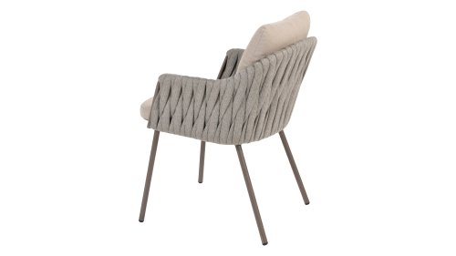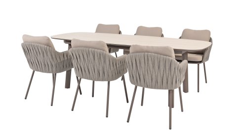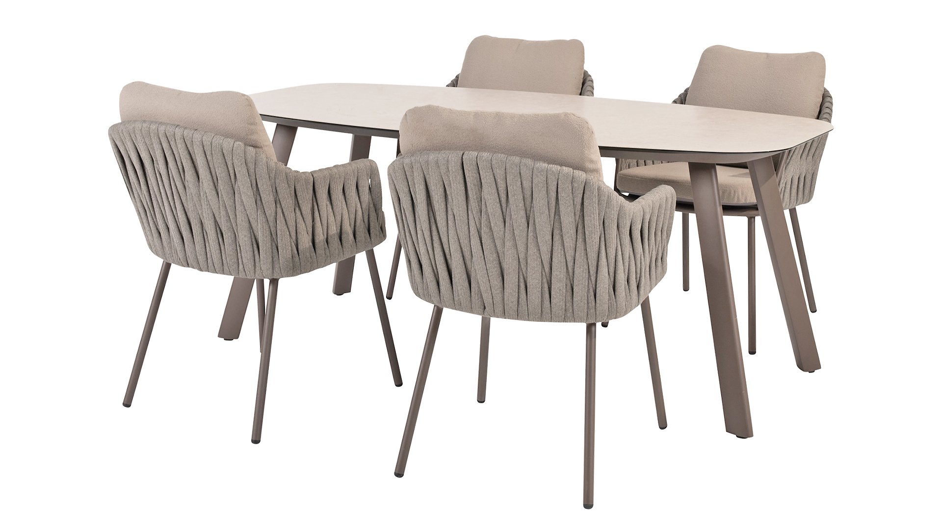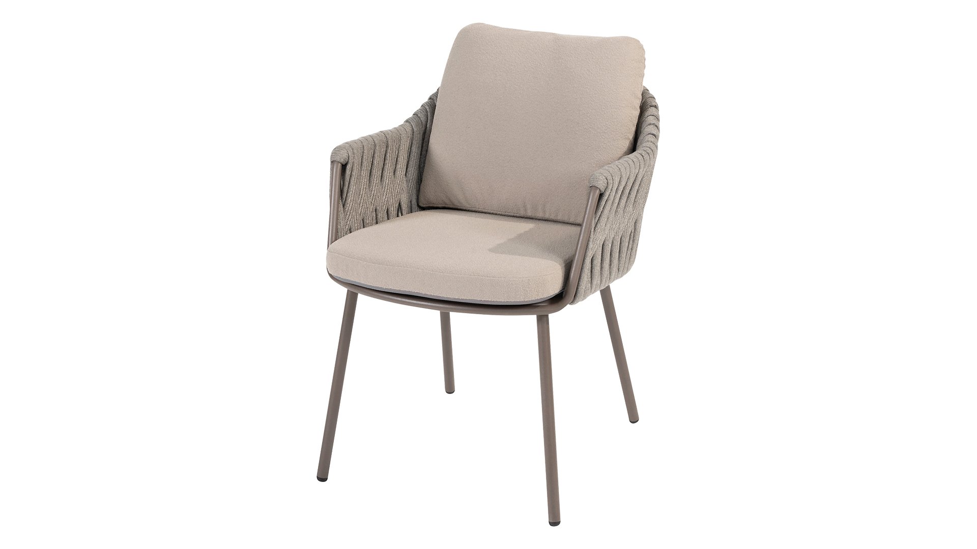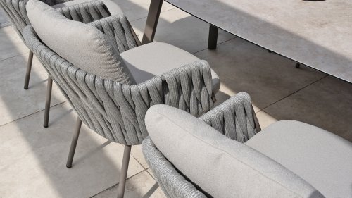 Taste by 4 Seasons Outdoor Cannes Dining – Elegant und modern: Die Gartenmöbelserie Cannes von Taste by 4 Seasons Outdoor verleiht jedem Außenbereich eine raffinierte und ruhige Atmosphäre. Das dezente, erdfarbene, pulverbeschichtete Aluminiumgestell bildet einen schönen Kontrast zum sanften, grauen Seilmuster, das kunstvoll um den Stuhl gewebt ist. Die großzügigen Olefin-Kissen in Hellgrau bieten nicht nur höchsten Sitzkomfort, sondern sind auch wetterfest. Dieses Set ist wie geschaffen für lange Abende mit Essen, entspannten Gesprächen und stimmungsvollen Momenten im Freien. Dank seiner hochwertigen Materialien und der luxuriösen Optik lädt die Cannes-Serie Sie Saison für Saison zum Genießen ein.