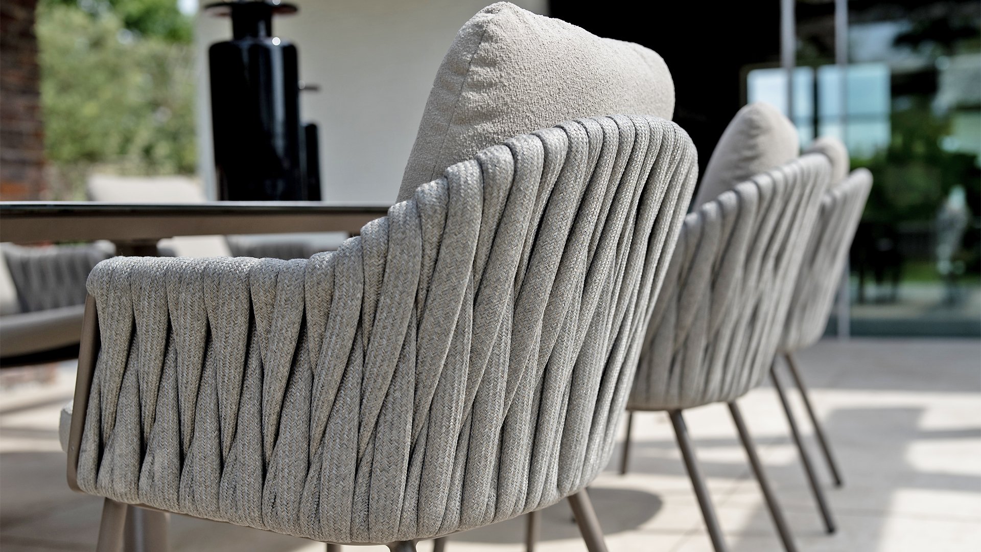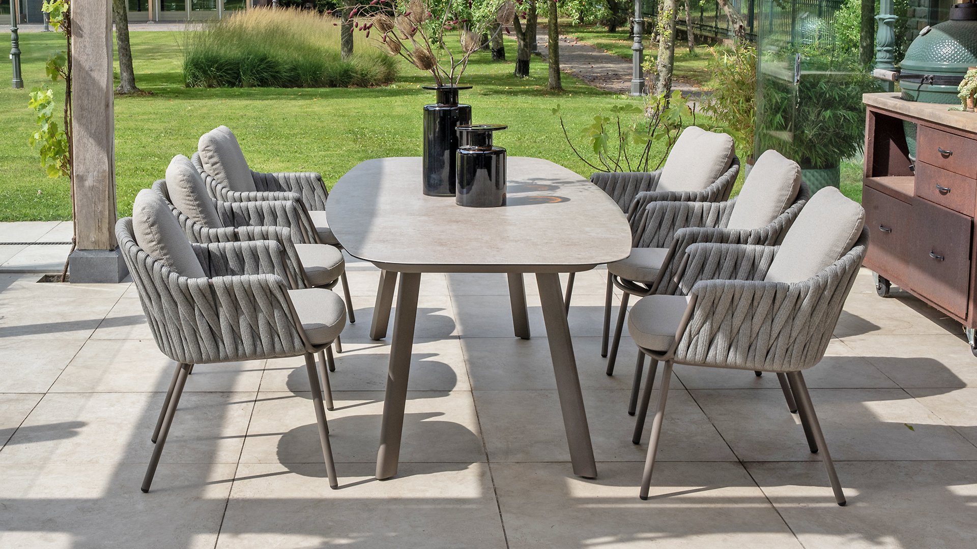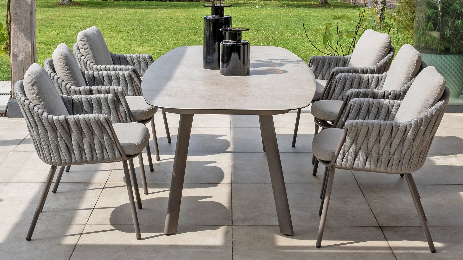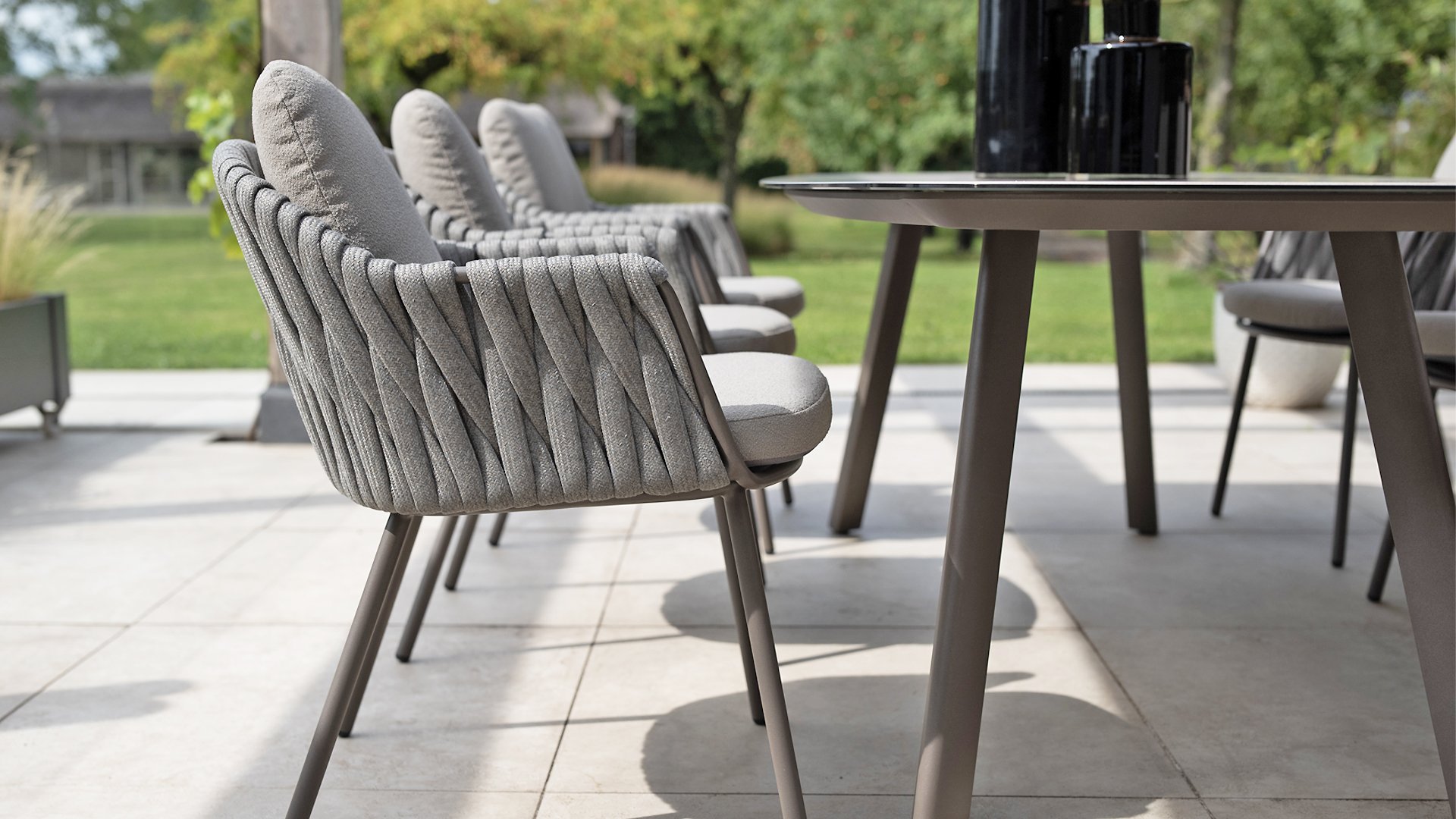 Das elegante, erdfarbene Gestell in Kombination mit dem stilvollen grauen Seilgeflecht verleiht dem Set einen modernen und warmen Look. - Wetterfeste Materialien
