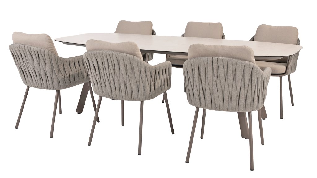Elegant und modern: Die Gartenmöbelserie Cannes von Taste by 4 Seasons Outdoor verleiht jedem Außenbereich eine raffinierte und ruhige Atmosphäre. Das dezente, erdfarbene, pulverbeschichtete Aluminiumgestell bildet einen wunderschönen Kontrast zum sanften, grauen Seilmuster, das kunstvoll um den Stuhl gewebt ist. Die großzügigen Olefin-Kissen in Hellgrau bieten nicht nur höchsten Sitzkomfort, sondern sind auch wetterfest. Dieses Set ist wie geschaffen für lange Abende beim Essen, entspannte Gespräche und stimmungsvolle Momente im Freien. Mit seinen hochwertigen Materialien und seiner luxuriösen Optik lädt die Cannes Sie Saison für Saison zum Genießen ein. Neben der Essgruppe ist die Taste 4SO Cannes auch als Low Dining-Set, Lounge-Set und High Dining-Set erhältlich, sodass Sie Ihren gesamten Garten im gleichen eleganten Stil einrichten können.