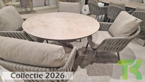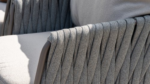 Der erdfarbene, pulverbeschichtete Aluminiumrahmen bildet einen eleganten Kontrast zum fein gewebten, hellgrauen Seil und verleiht dem Set einen modernen und einladenden Look. Die großzügigen Olefin-Kissen in einem sanften Grau bieten nicht nur höchsten Komfort, sondern sind auch äußerst widerstandsfähig gegen UV-Strahlung und Witterungseinflüsse. Neben diesem Low Dining-Set ist die Taste 4Seasons Cannes Kollektion auch als Esstisch set, Loungeset und High Dining-Set erhältlich, sodass Sie Ihren Außenbereich mit demselben stilvollen Ambiente ausstatten können.