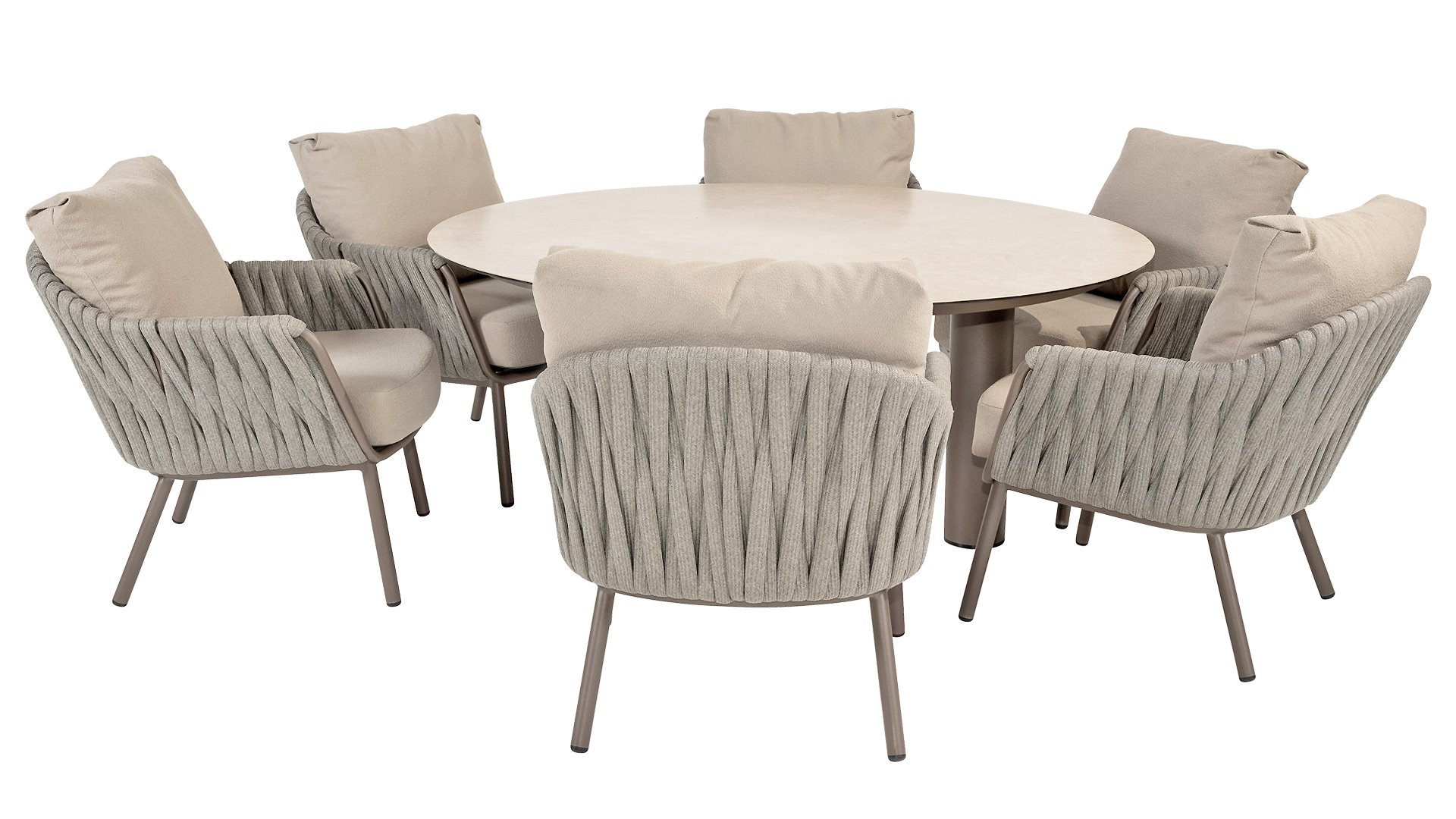 Das Taste Cannes Low Dining-Set vereint Luxus mit entspanntem Outdoor-Wohnkomfort. Es ist lässig, ungezwungen und außergewöhnlich bequem. Im Gegensatz zu herkömmlichen Essgruppen ist es niedriger, sodass Sie in einer angenehmen Lounge-Höhe speisen und eine gemütliche, entspannte Atmosphäre genießen können. Perfekt für lange Abende im Freien, ungezwungene Abendessen oder Drinks mit Freunden und Familie. Der erdfarbene, pulverbeschichtete Aluminiumrahmen bildet einen eleganten Kontrast zum fein gewebten, hellgrauen Seil und verleiht dem Set einen modernen und einladenden Look. Die großzügigen Olefin-Kissen in einem sanften Grau bieten nicht nur höchsten Komfort, sondern sind auch äußerst widerstandsfähig gegen UV-Strahlung und Witterungseinflüsse. Neben diesem Low Dining-Set ist die Taste 4Seasons Cannes Kollektion auch als Esstisch set, Loungeset und High Dining-Set erhältlich, sodass Sie Ihren Außenbereich mit demselben stilvollen Ambiente ausstatten können.