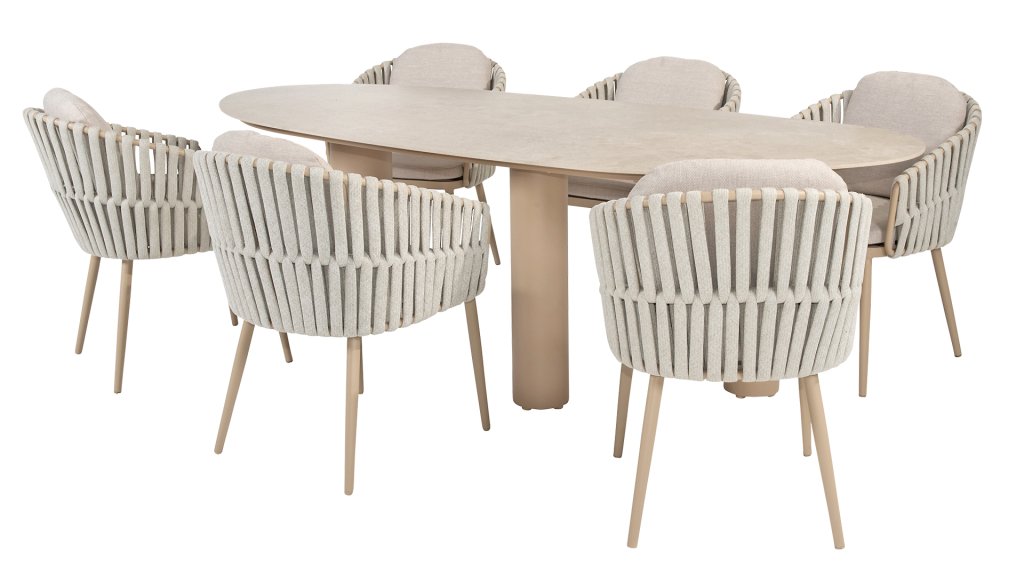 Leidenschaft für Eva Entworfen mit Liebe zum Detail. Die dickem, weichen Seilbänder folgen der schönen organischen Form des Rahmens. Dazu kommen die herrlich bequemen Kissen hinzu und du verstehst, warum wir so begeistert sind von der Taste by 4 Seasons Outdoor Eva Lounge- & Diningset. Der Taste 4SO Eva Dining Stuhl hat ein modernes Design. Der Stuhl wird mit weichen Kissen geliefert und verfügt über einen zeitgemäßen, Aluminium-Rahmen mit passender, latte Seilpolsterung. Das dicke Seil passt gut zum lattefarbenen Rahmen und sorgt zusammen mit den Kissen für einen bequemen Sitzkomfort. Eine Farbe, die am besten als geschmackvolles Beige beschrieben werden kann.