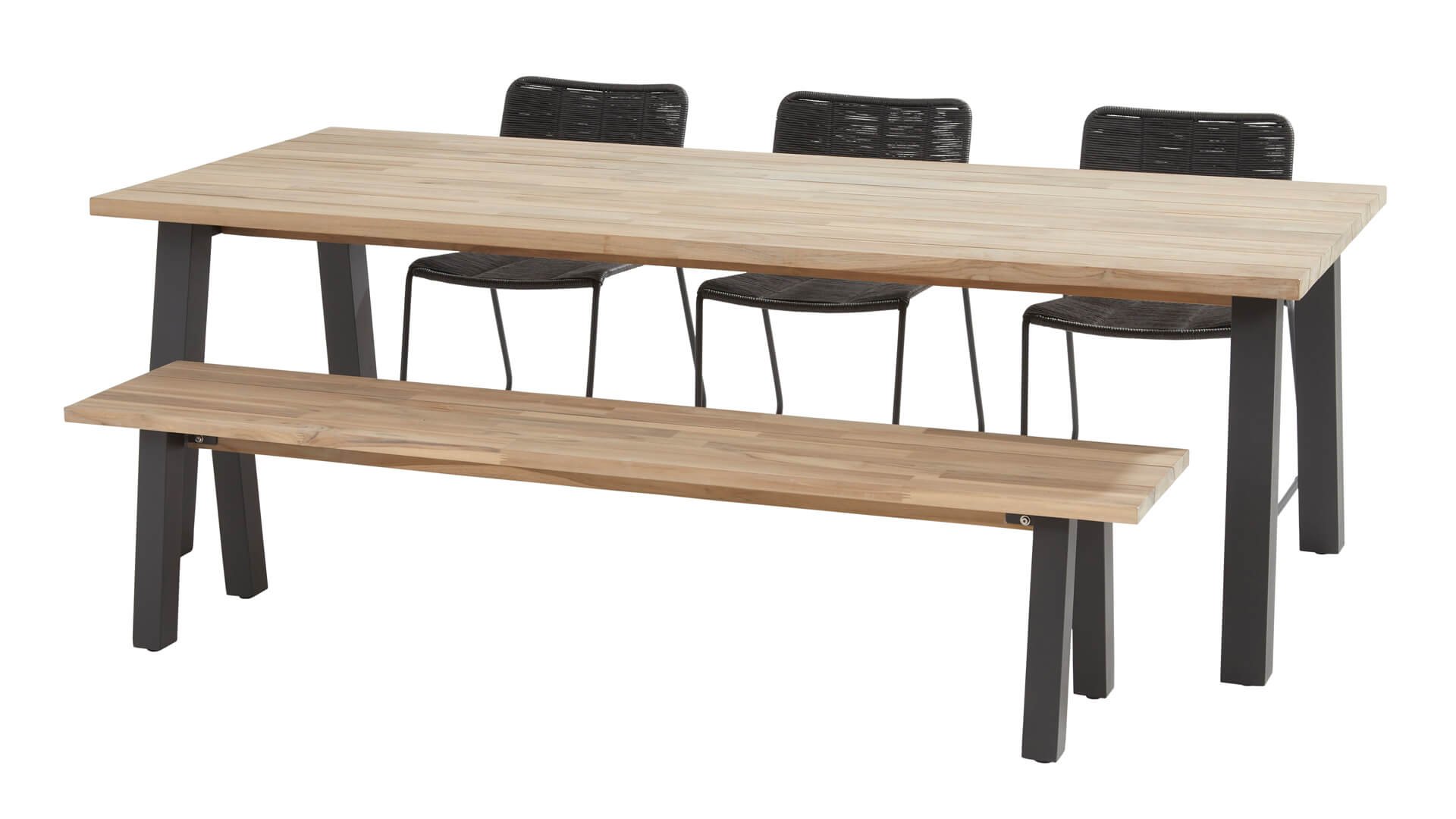 Der Derby 240 mit Aluminiumbein ist ein pragmatischer Esstisch. Die Teakholzplanken sind schräg gesägt und verleihen dem Tisch eine verspielte Optik. Auch mit Teakbeinen erhältlich. Die Teakbank Derby 200 bietet Platz für 3 Erwachsene. Dank seiner etwas kürzeren Maße fällt das Platznehmen und Aufstehen leichter.