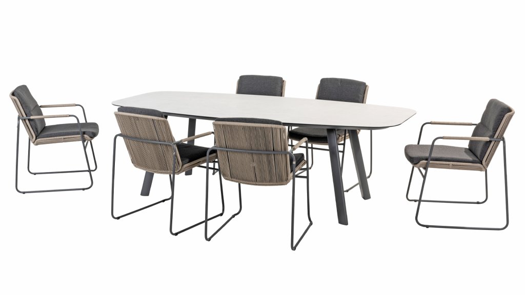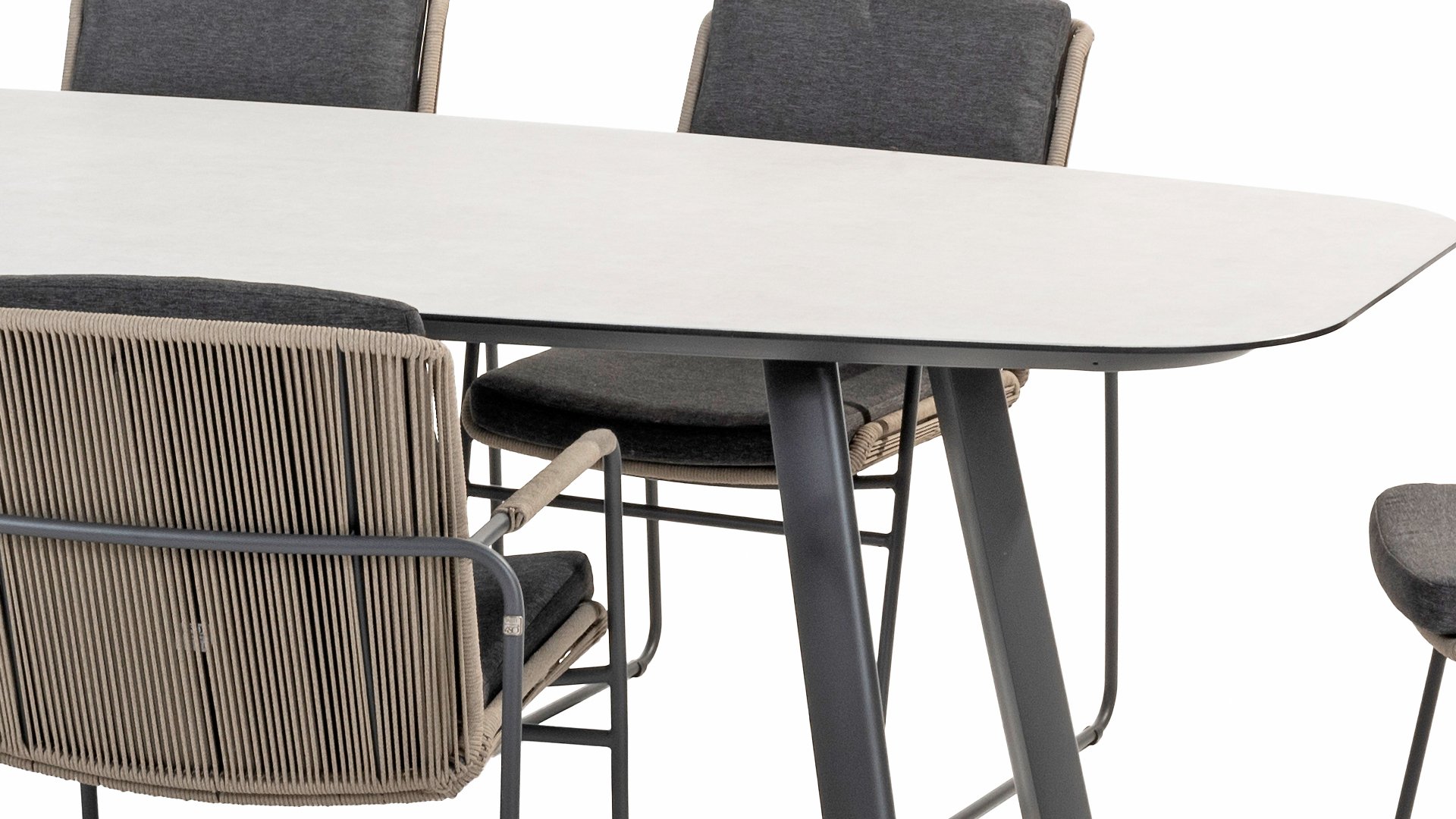 Suchen Sie einen pflegeleichten Tisch mit modernem Look? Dann schauen Sie sich den Manolo Tisch von Taste 4SO an welche auch verfügbar ist im Latte farbe. Die Form der Tischplatte und die Position der Aluminium-Tischbeine machen diesen Tisch sehr praktisch. Die Form schafft ausreichend Platz auf allen Seiten des Tisches. Der Tisch zeichnet sich durch die dänische ovale Tischplatte aus Keramik aus, sodass der Tisch das ganze Jahr über draußen bleiben kann.