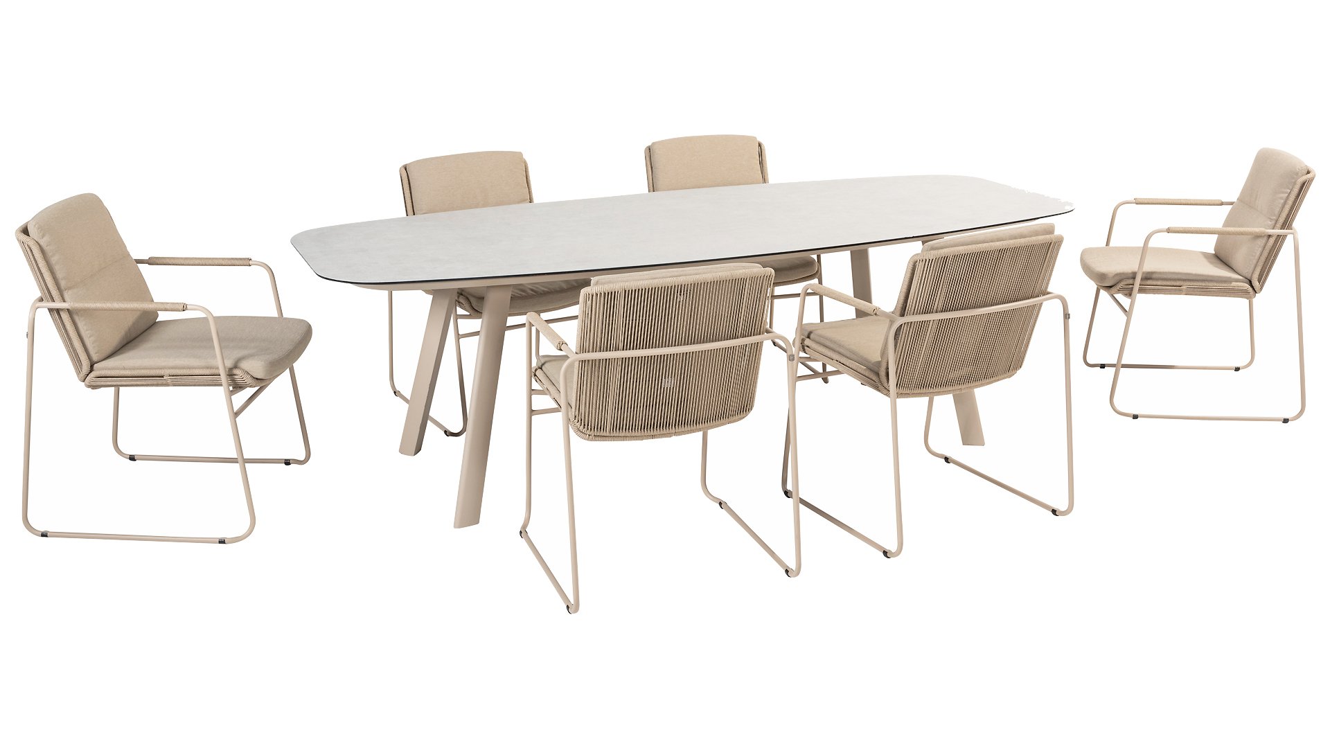 Suchen Sie einen pflegeleichten Tisch mit modernem Look? Dann schauen Sie sich den Taste by 4 Seasons Outdoor Manolo 240cm, verfügbar in der farben Anthrazit, Latte und Cloud erhältlich ist. Die Form der Tischplatte und die Position der Aluminium-Tischbeine machen diesen Tisch sehr praktisch. Die Form schafft ausreichend Platz auf allen Seiten des Tisches. Der Tisch zeichnet sich durch die dänische ovale Tischplatte aus Glass Printed Keramik aus, sodass der Tisch das ganze Jahr über draußen bleiben kann. Kein Platz für einen 240 cm Tisch? Dann könnte der Taste 4 Seasons Manolo 75 cm eine Alternative sein, erhältlich in Latte und Anthrazit.