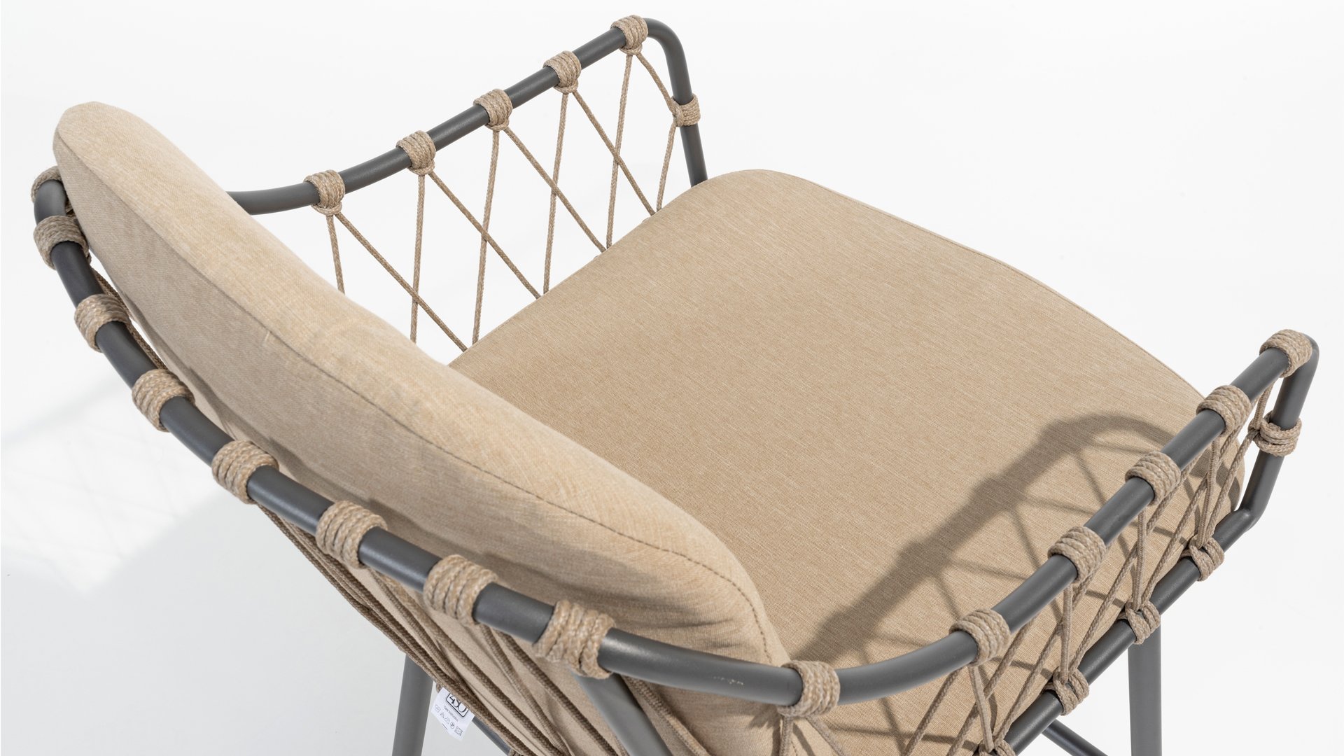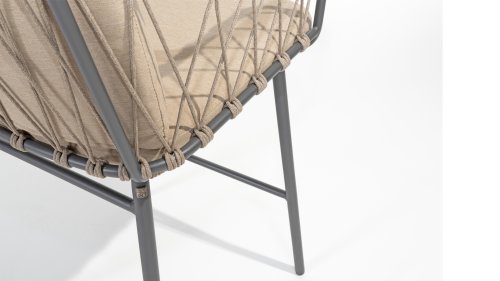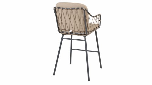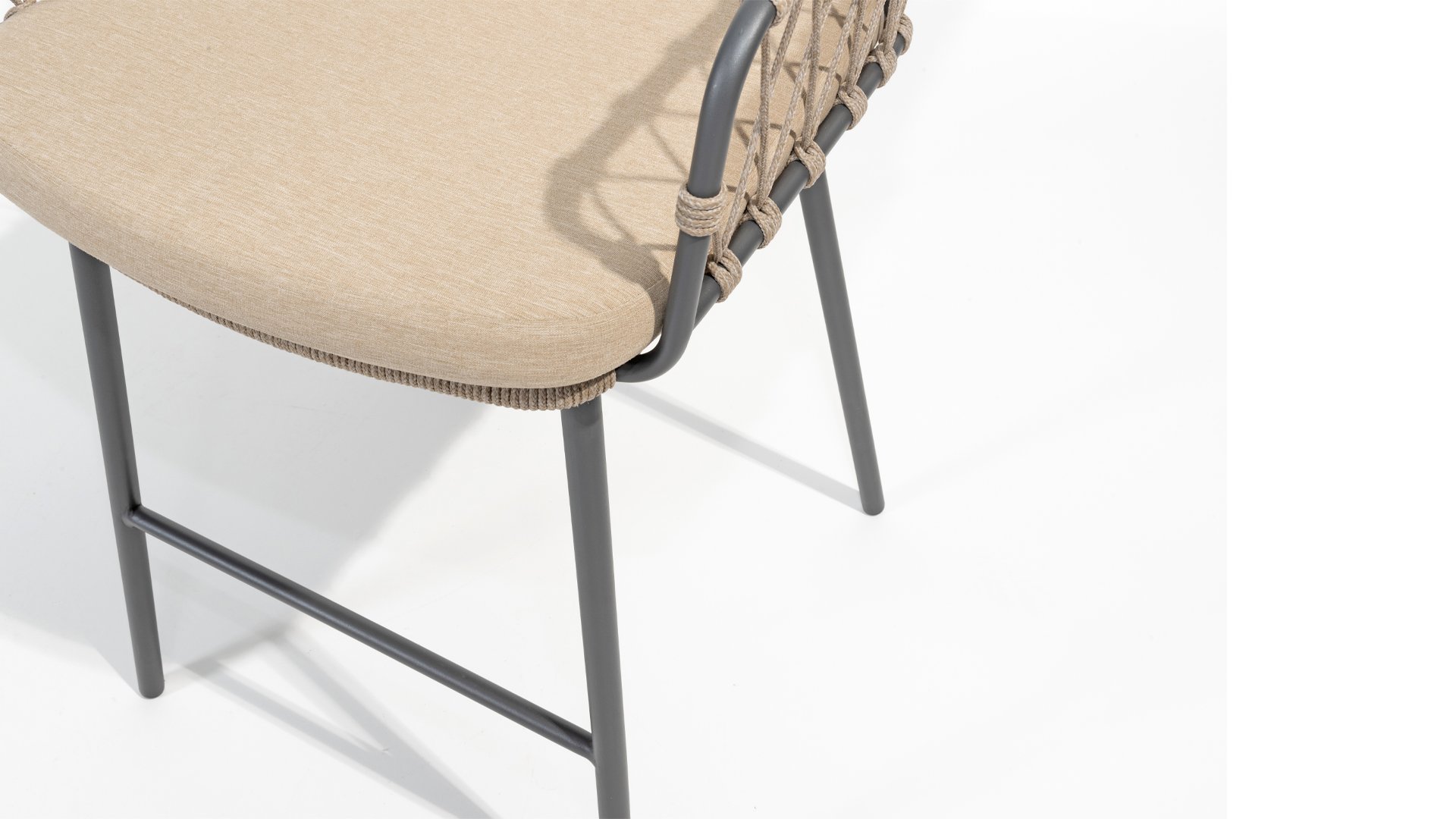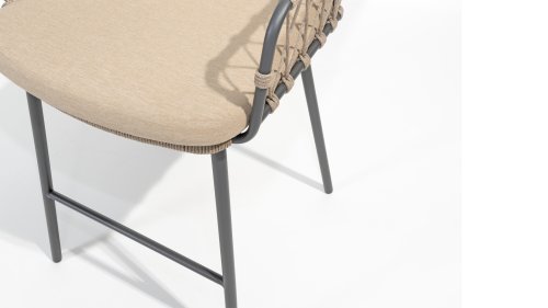Der Prego Barhocker ist mit einem robusten anthrazitfarbenen Edelstahl- und Aluminiumrahmen ausgestattet, der nicht nur Langlebigkeit und Stabilität garantiert, sondern auch zu seinem modernen Erscheinungsbild beiträgt. Der Taupe-Seilbezug verleiht ihm ein zeitgemäßes Aussehen.