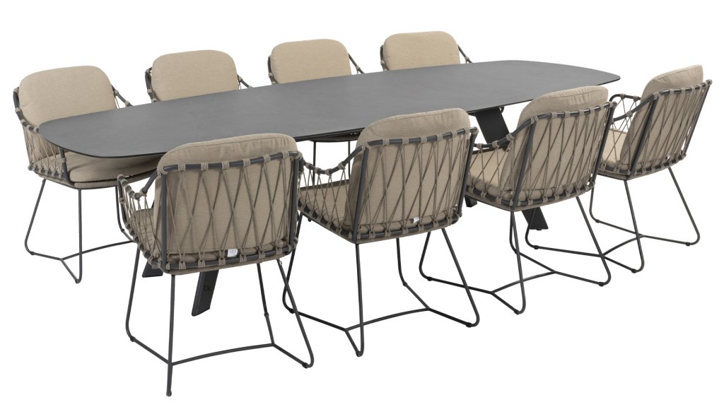 Der 4Seasons Outdoor Montana ist ein wunderschöner Tisch, der sofort ins Auge fällt. Es sieht nicht nur modern aus, sondern ist durch die Form der Tischplatte auch äußerst praktisch. Der Tisch zeichnet sich durch seine dänisch-ovale Tischplatte aus, die Form schafft ausreichend Platz auf allen Seiten des Tisches. Bei der Montana-Serie gibt es mehrere Optionen; Die 240 cm hohe Terrazzo-Keramikplatte kann mit einem Untergestell aus Edelstahl oder Teakholz kombiniert werden. Innerhalb der Montana-Serie gibt es auch einen 280 cm großen Tisch mit HPL-Platte. Diese Tabelle bietet: