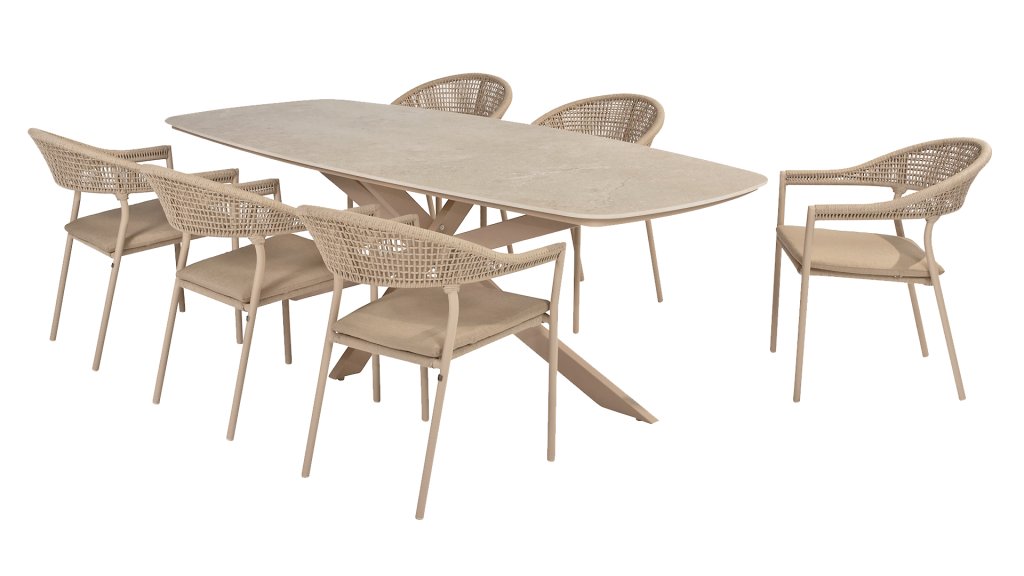 Die Terrassenmöbelserie Taste Sienna besticht durch ihren einzigartigen Stil, der durch moderne Seilelemente noch unterstrichen wird! Die Schönheit liegt im Detail. Die Rückenlehne der Sienna-Essgruppe von Taste by 4Seasons ist aus Seil geflochten und bietet so eine stabile und zugleich bequeme Sitzfläche. Das Gestell erzeugt ein verspieltes und minimalistisches Zusammenspiel fließender Linien und bildet eine solide Basis. Ein wahrer Augenschmaus! Die Sienna ist in den Farben Latte, Terre und Anthrazit erhältlich.