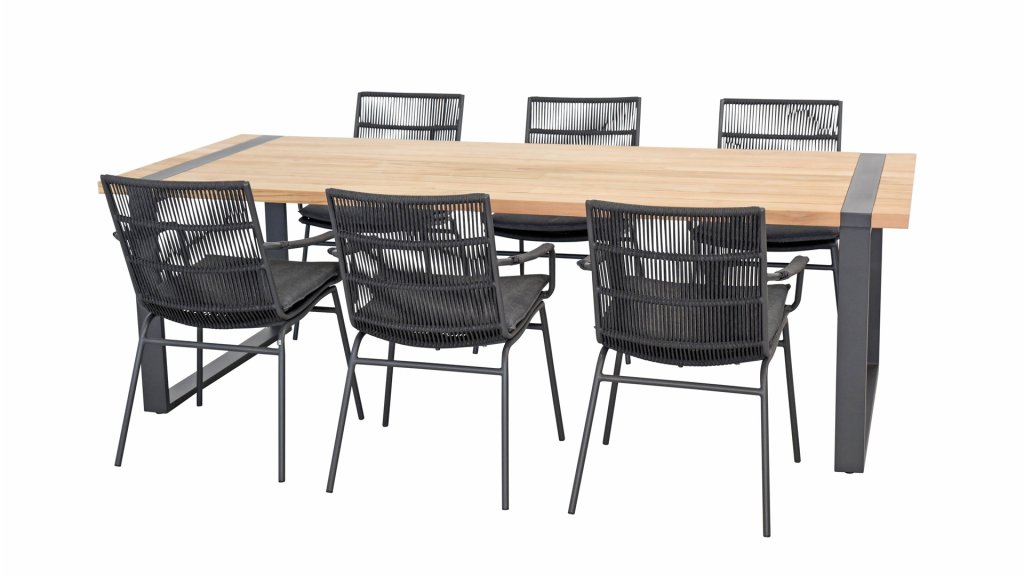 Der Taste by 4Seasons Alto 240cm Tisch hat ein industrielles Design. Das warme Teakholz wird wunderschön mit einer Aluminiumleiste kombiniert, die sich bis in das Bein fortsetzt. Das Aluminium ist pulverbeschichtet. Das Mittelbein ist standardmäßig enthalten, der Tisch kann aber auch ohne Mittelbein verwendet werden, das Teakholz muss nicht behandelt werden.
