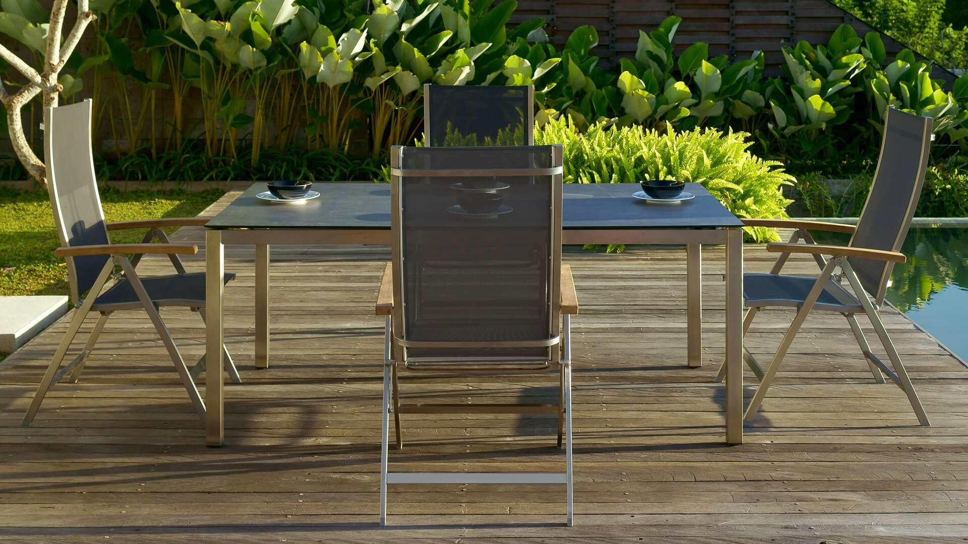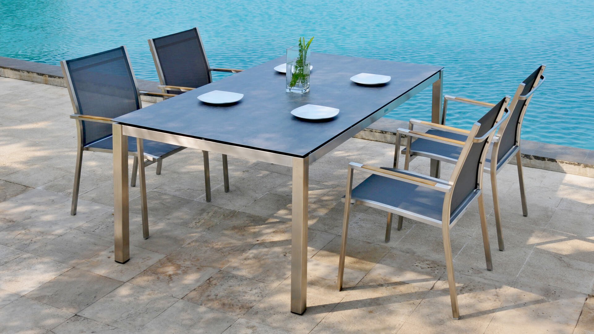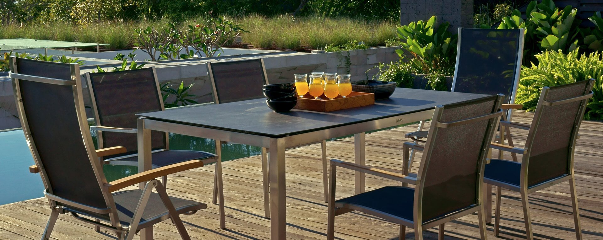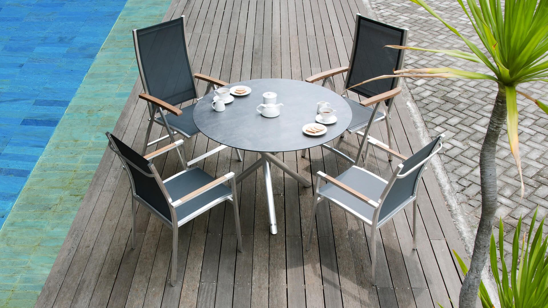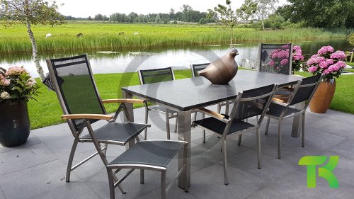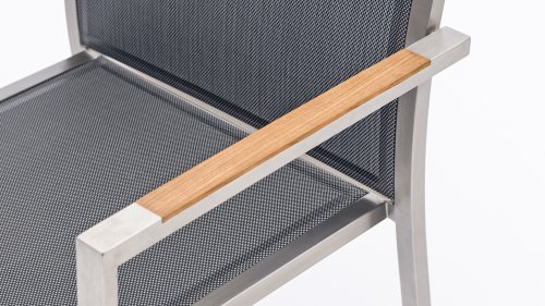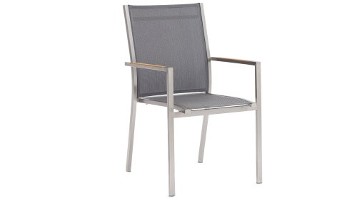 Das Zebra One Dining: Das Gestell aus gebürstetem Edelstahl ist mit Dark grey oder Dark platinum Textilene-Stoff bezogen. Dieser Edelstahl-Stapelstuhl 'One' von Zebra ist nicht nur ein ergonomisch perfektionierter Stuhl, sondern überzeugt auch durch sein minimalistisches Design und die fein abgesetzte Armlehne aus Teakholz in Edelstahl. Der Zebra One Gartenstuhl zeichnet sich, wie bei Stapelstühlen üblich, durch eine höhere Rückenlehne aus und schafft so einen wunderbaren Sitzkomfort. Auch stapelbare und verstellbare Stühle sind in dieser Serie erhältlich.