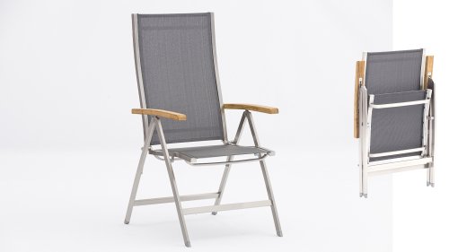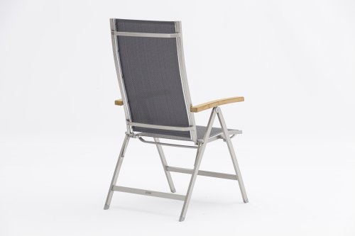 Die Rückenlehne ist ergonomisch leicht nach hinten gebogen. Beim Zurücklehnen kommt Ihnen diese Form zugute, da der Rücken optimal gestützt wird. Die Armlehne des One Stapelstuhls bestehen aus Teakholz. Eine angenehme Haptik resultiert daraus und Ihre Arme liegen nicht direkt auf dem kühlen Edelstahl. Außerdem tragen die direkt ins Edelstahlgestell eingelassenen Teakarmlehnen natürlich zur besonderen Optik des Möbelstücks bei. Neben den Armlehnen ist das Erscheinungsbild des Freitzeitstuhls von Zebra vor allem durch das zierliche, geradlinige Gestell geprägt. Hochwertiges Textilen in der Farbstellung dark grey komplettiert den Zebra One Stapelsessel zu einem optisch ansprechenden sowie auch bequemen, outdoorgeeigneten Stuhl. Das filigrane Design sorgt für Leichtigkeit auf Ihrer Terrasse, die Stabilität des Gartenstuhls wurde von Zebra hierbei aber gewiss nicht vernachlässigt.