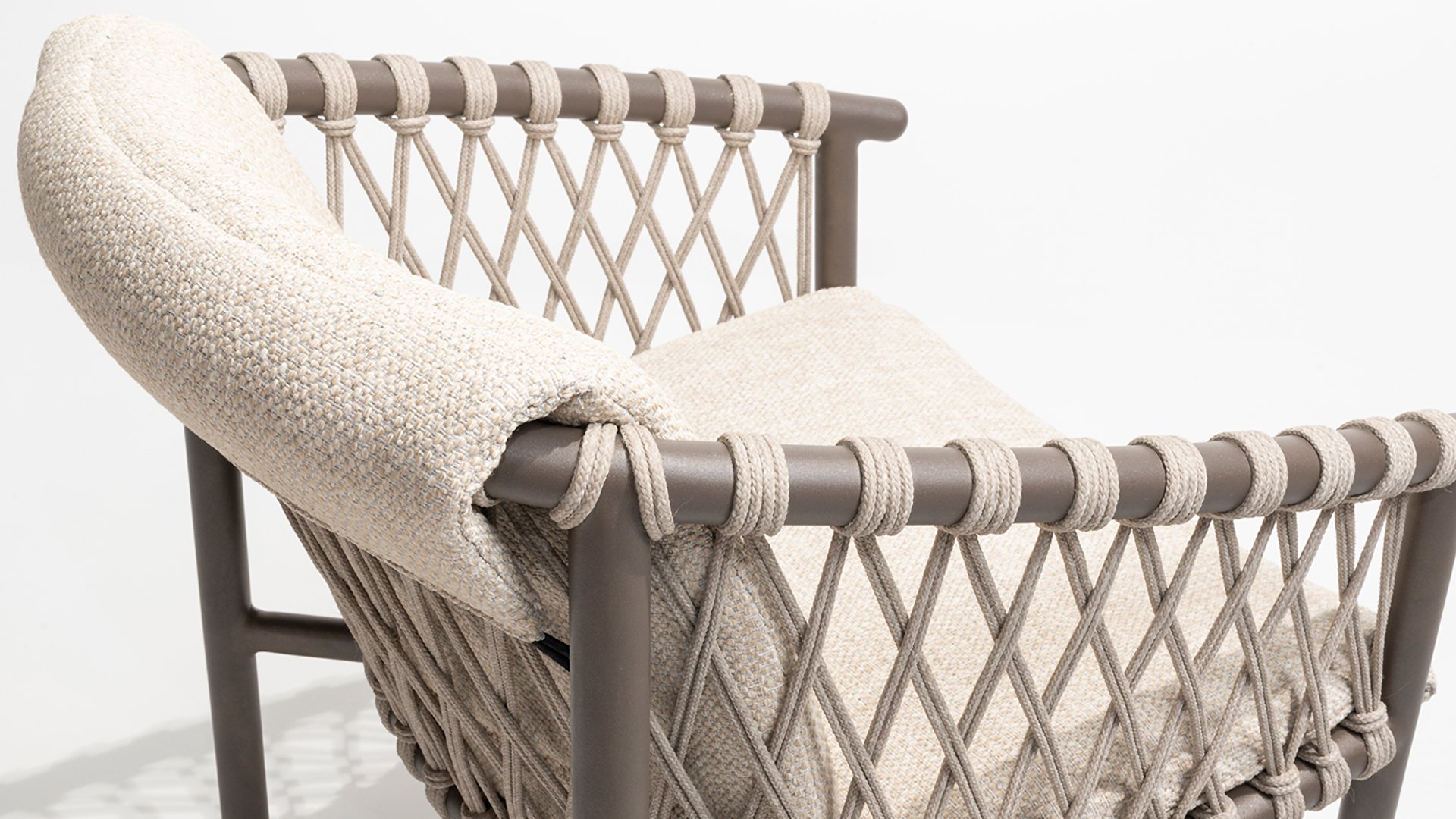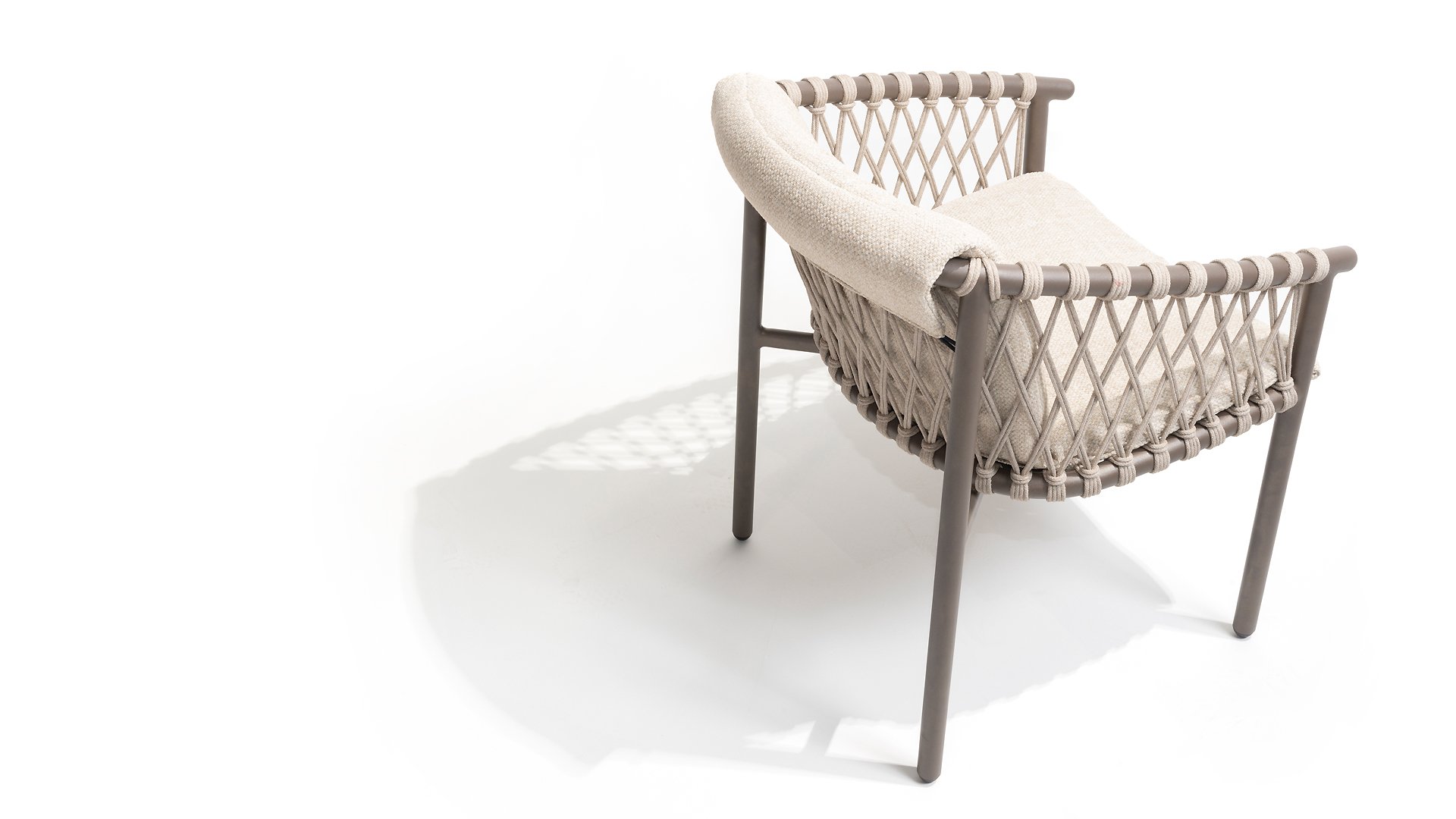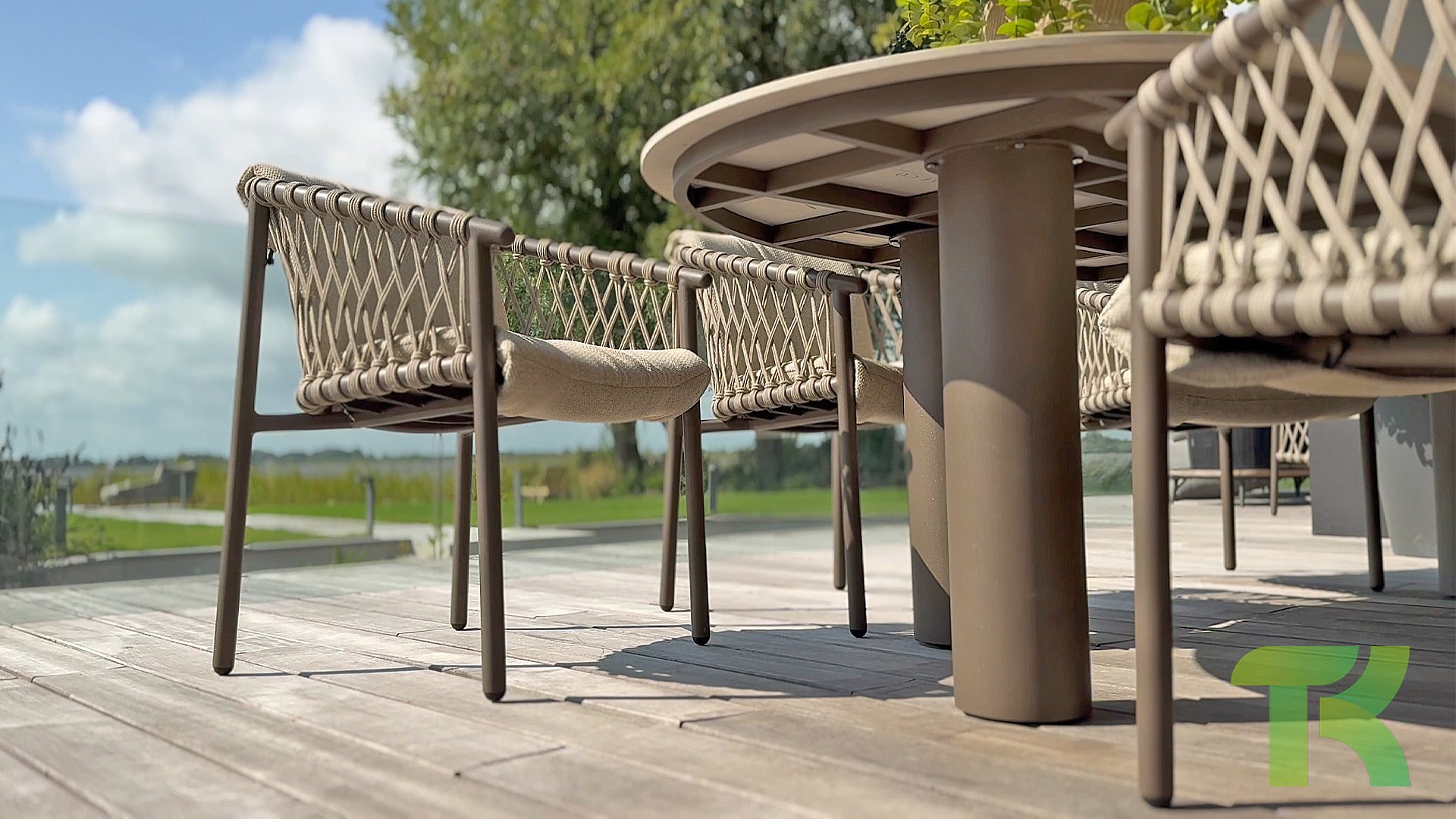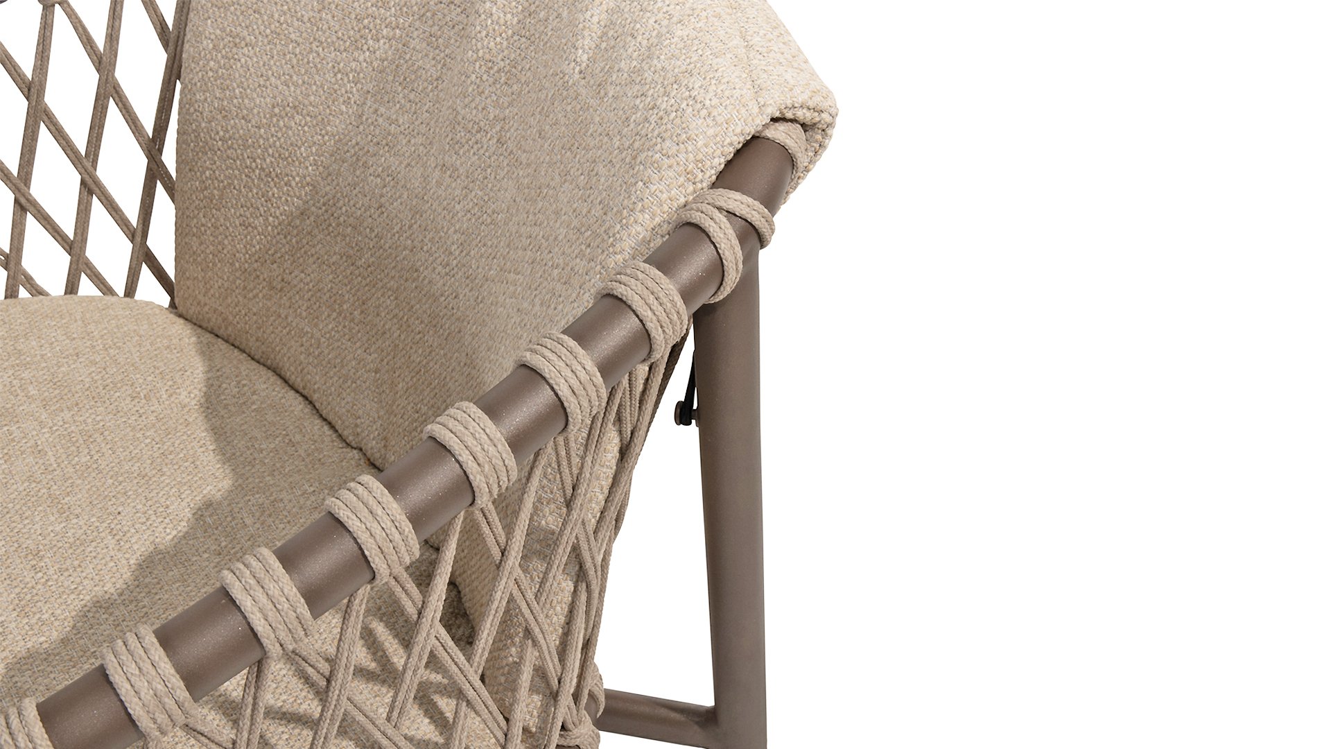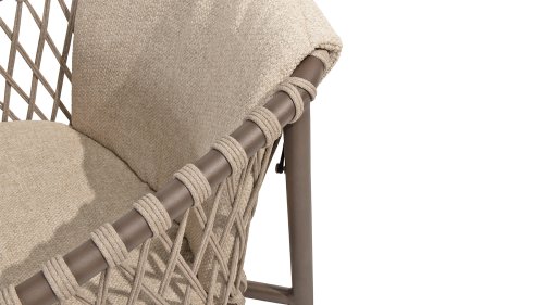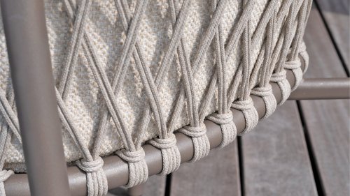 The 4SO Allora chair is a stylish and comfortable choice for both indoor and outdoor use, with a modern look that fits various garden settings. The chair is available in two variants: Latte and Terre. The Allora chair is made from rope wire and powder-coated aluminum, providing both durability and a light, modern appearance. The use of rope wire makes the chair playful and breathable. The powder-coated aluminum frame offers extra protection against weather elements and makes the chair low maintenance and lightweight.