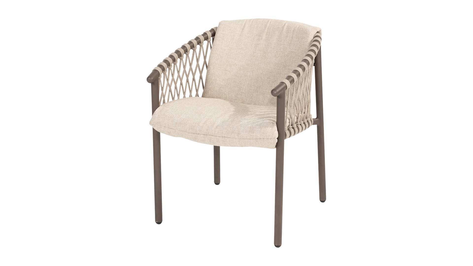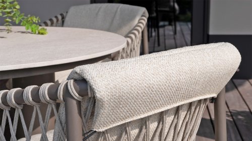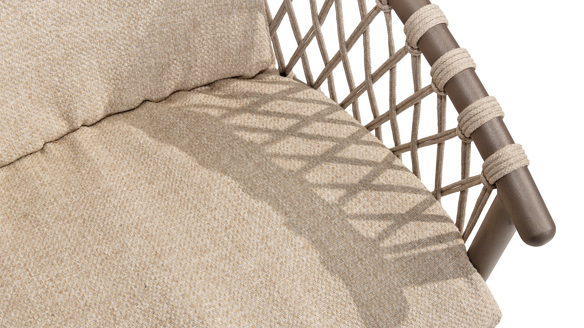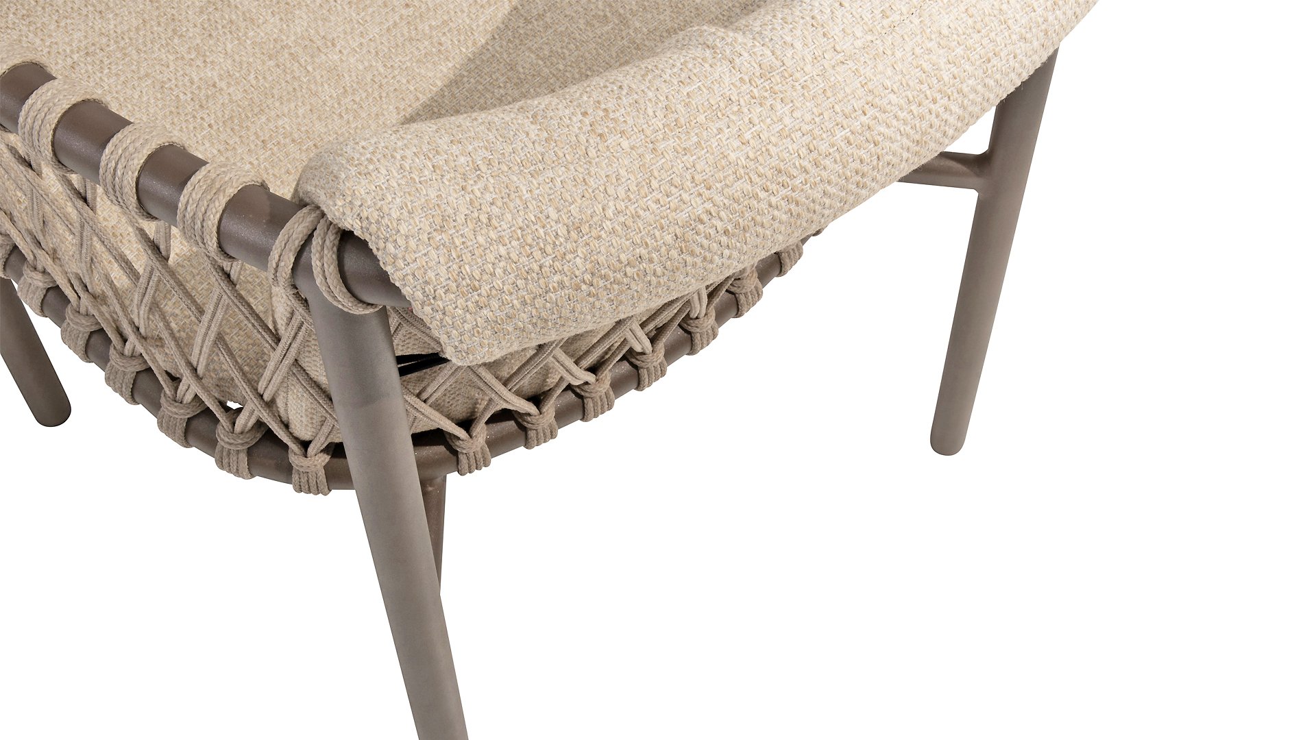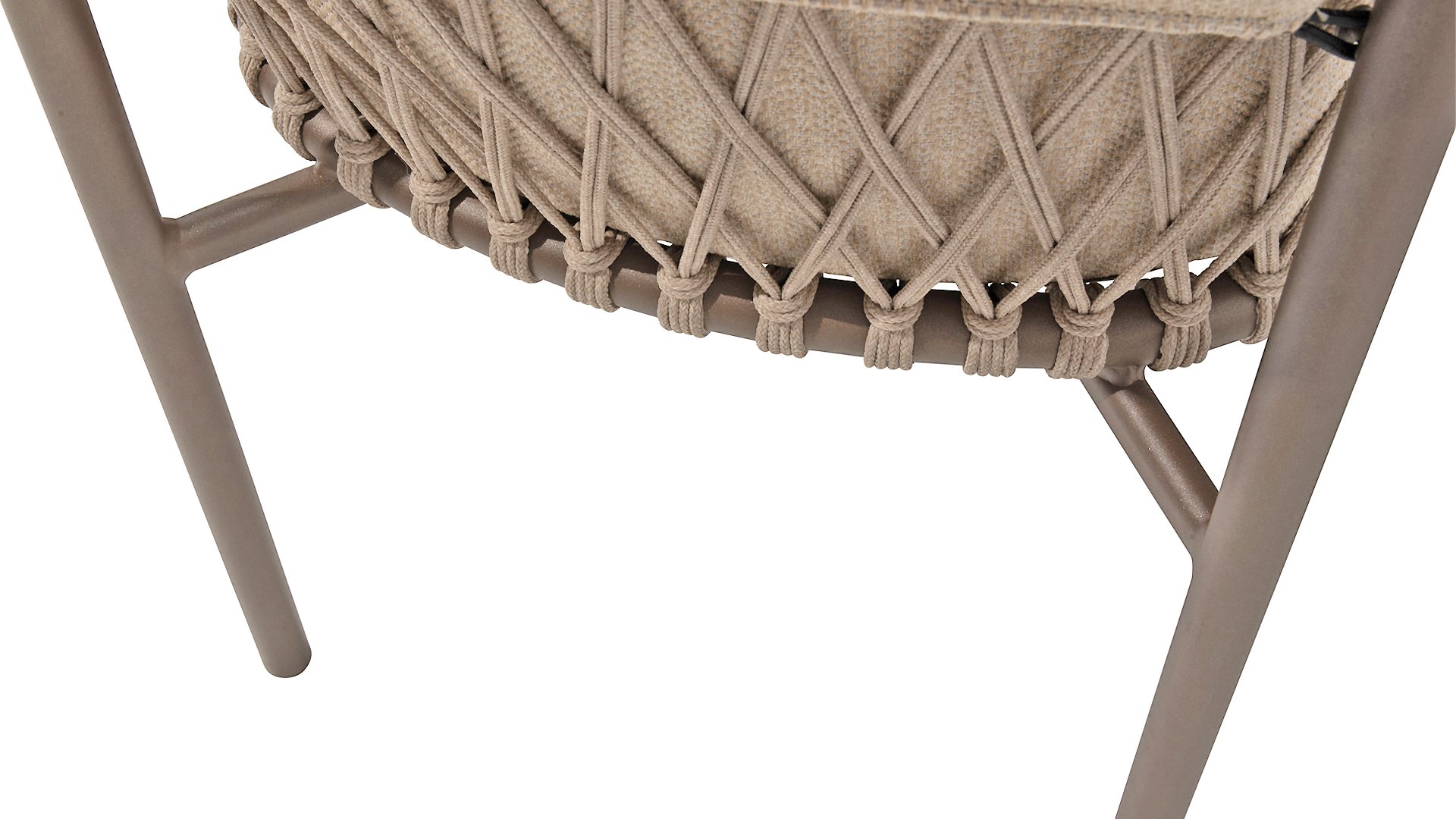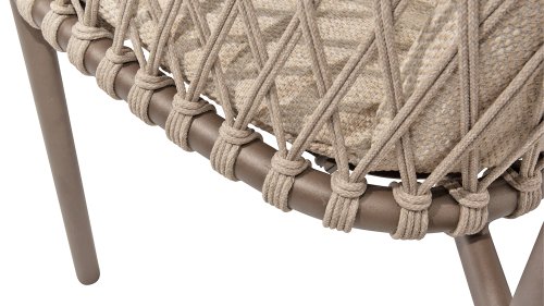 The 4SO Allora chair is a stylish and comfortable choice for both indoor and outdoor use, with a modern look that fits various garden settings. The chair is available in two variants: Latte and Terre. The Allora chair is made from rope wire and powder-coated aluminum, providing both durability and a light, modern appearance. The use of rope wire makes the chair playful and breathable. The powder-coated aluminum frame offers extra protection against weather elements and makes the chair low maintenance and lightweight.