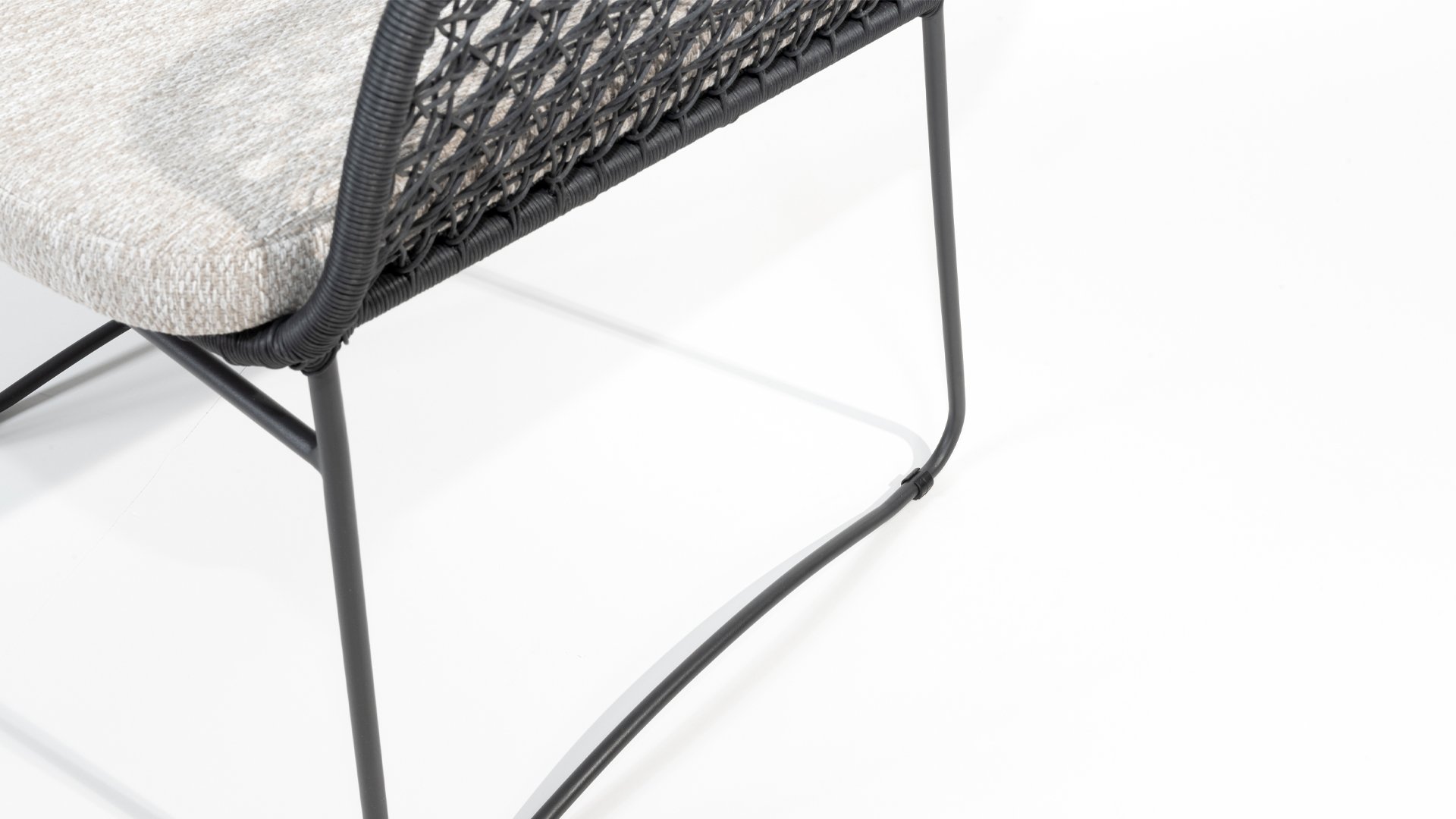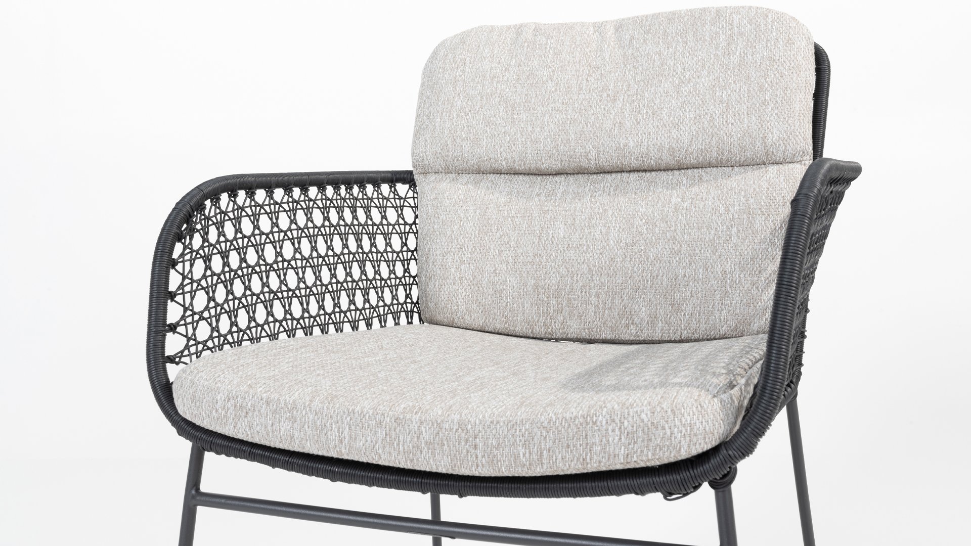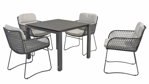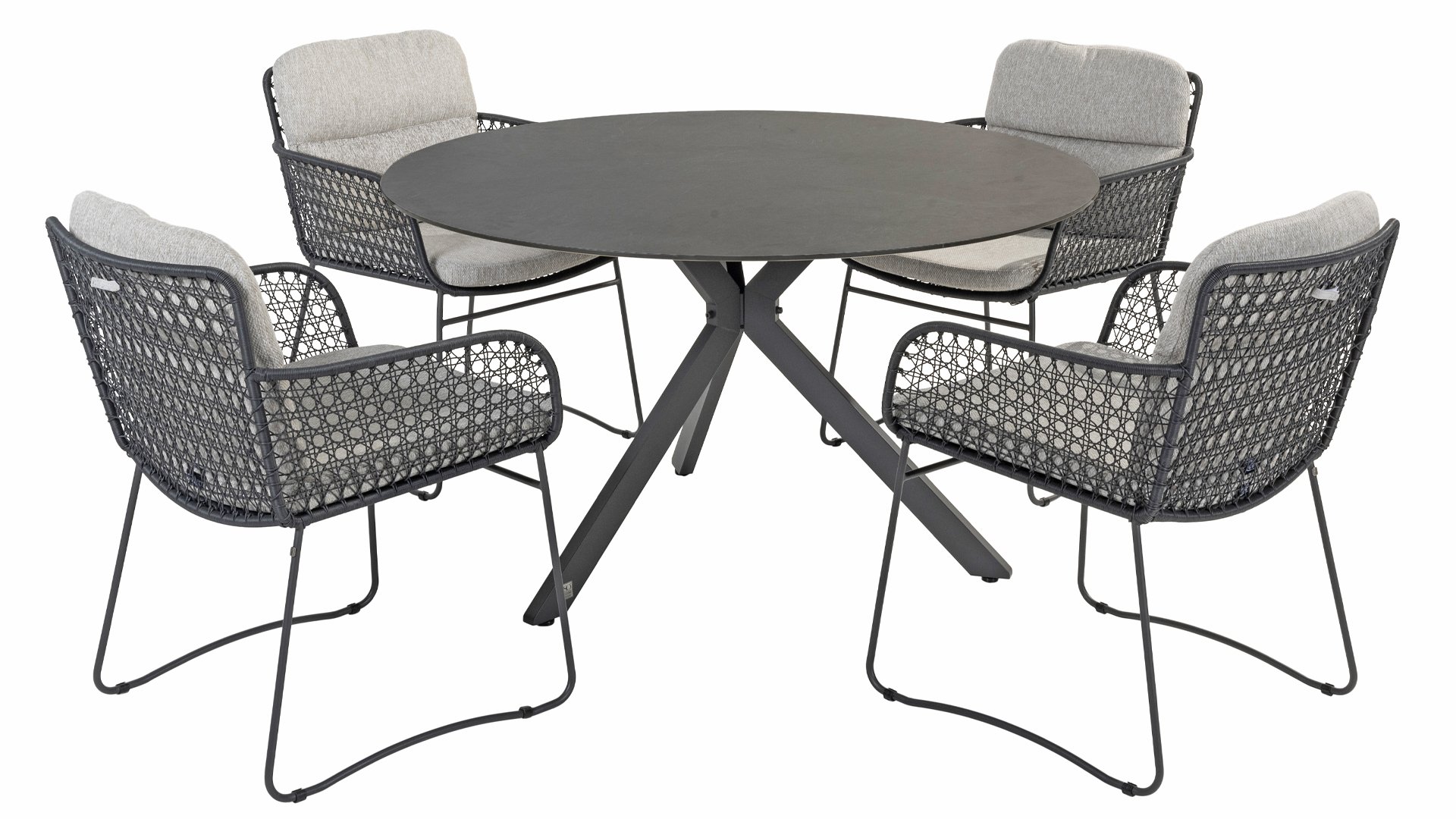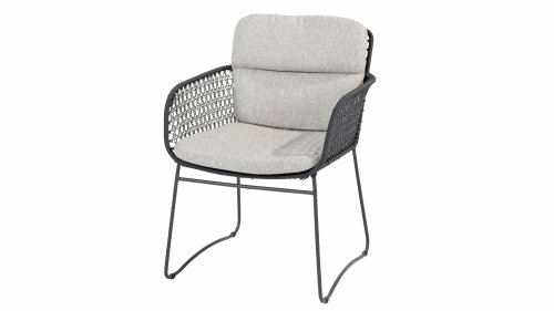 Discover the elegance and durability of the 4 Seasons Outdoor Aprilla dining chair in stylish anthracite. This chair comes with cushions and features a beautiful pattern of anthracite wickerwork and an anthracite stainless steel frame.