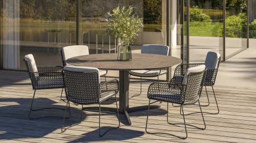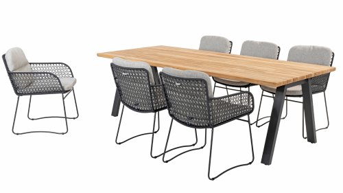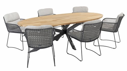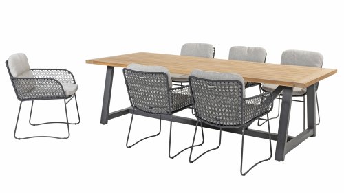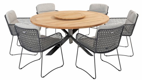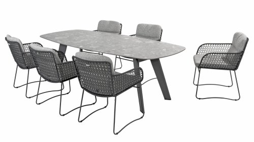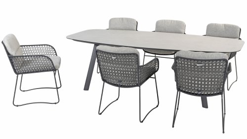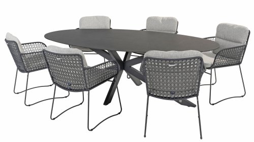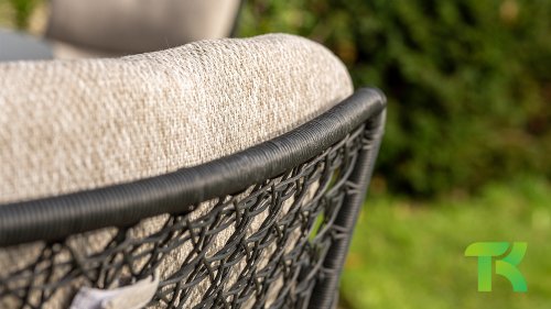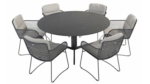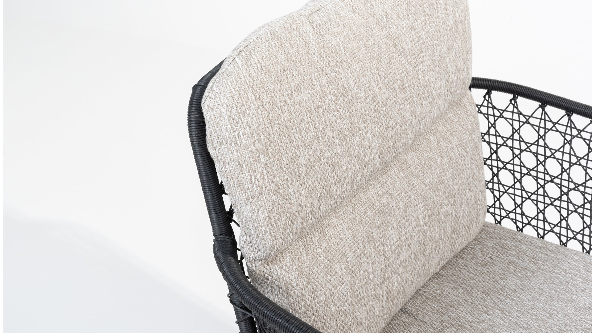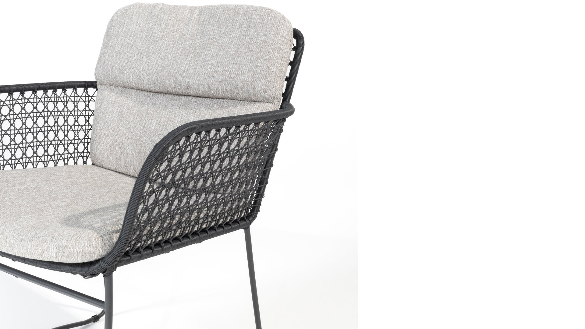 Discover the elegance and durability of the 4 Seasons Outdoor Aprilla dining chair in stylish anthracite. This chair comes with cushions and features a beautiful pattern of anthracite wickerwork and an anthracite stainless steel frame.