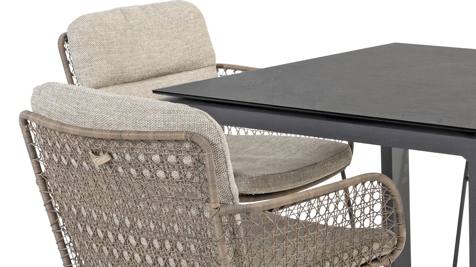 This beautiful material is perfect for outdoor use, because 4SO Rope is not just an shoelace. Our round wires have a synthetic core. This polypropylene base ensures minimal stretching of the rope and also does not absorb moisture. The covering is made of an acrylic fabric, similar to the weather-resistant fabric of our garden cushions. This covering feels soft but is highly water-repellent, UV-resistant, and colorfast. The flat rope variants have the same mix of weather-resistant materials, but the polypropylene material is interwoven with the acrylic fabric. This technique gives the flat rope the same properties but a completely different look. The stretch is minimal, and 4 Seasons Outdoor garden furniture with Rope is suitable for people weighing up to 110 kg. It's therefore an exceptionally strong material, but it's important to be careful with sharp objects. Our Rope is weather-resistant, but a sharp object can seriously damage your garden furniture. We offer exclusive designs using hand-woven Rope patterns and techniques.