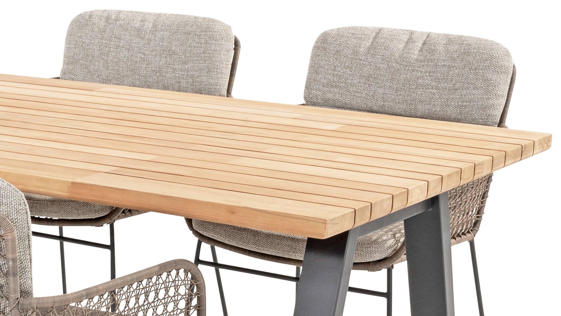 The teak garden table Ambassador is a popular model within the beautiful range of Taste 4SO. Ambassador tables. A striking detail of the teak top of the Ambassador table is the different widths of the planks. This beautiful effect is clearly visible in the detailed photos. It creates an original and contemporary look. The frame is made of powder-coated stainless steel.