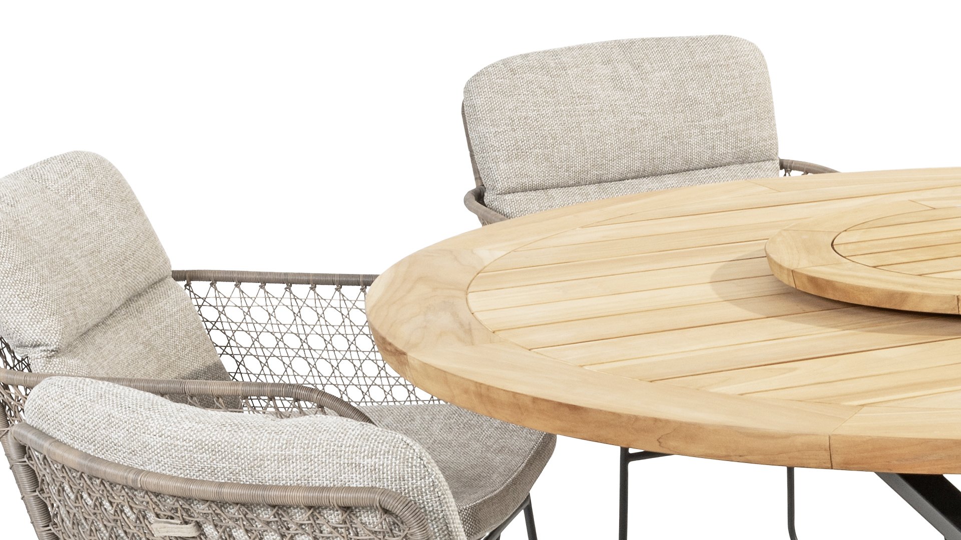 This beautiful material is perfect for outdoor use, because 4SO Rope is not just an shoelace. Our round wires have a synthetic core. This polypropylene base ensures minimal stretching of the rope and also does not absorb moisture. The covering is made of an acrylic fabric, similar to the weather-resistant fabric of our garden cushions. This covering feels soft but is highly water-repellent, UV-resistant, and colorfast. The flat rope variants have the same mix of weather-resistant materials, but the polypropylene material is interwoven with the acrylic fabric. This technique gives the flat rope the same properties but a completely different look. The stretch is minimal, and 4 Seasons Outdoor garden furniture with Rope is suitable for people weighing up to 110 kg. It's therefore an exceptionally strong material, but it's important to be careful with sharp objects. Our Rope is weather-resistant, but a sharp object can seriously damage your garden furniture. We offer exclusive designs using hand-woven Rope patterns and techniques.