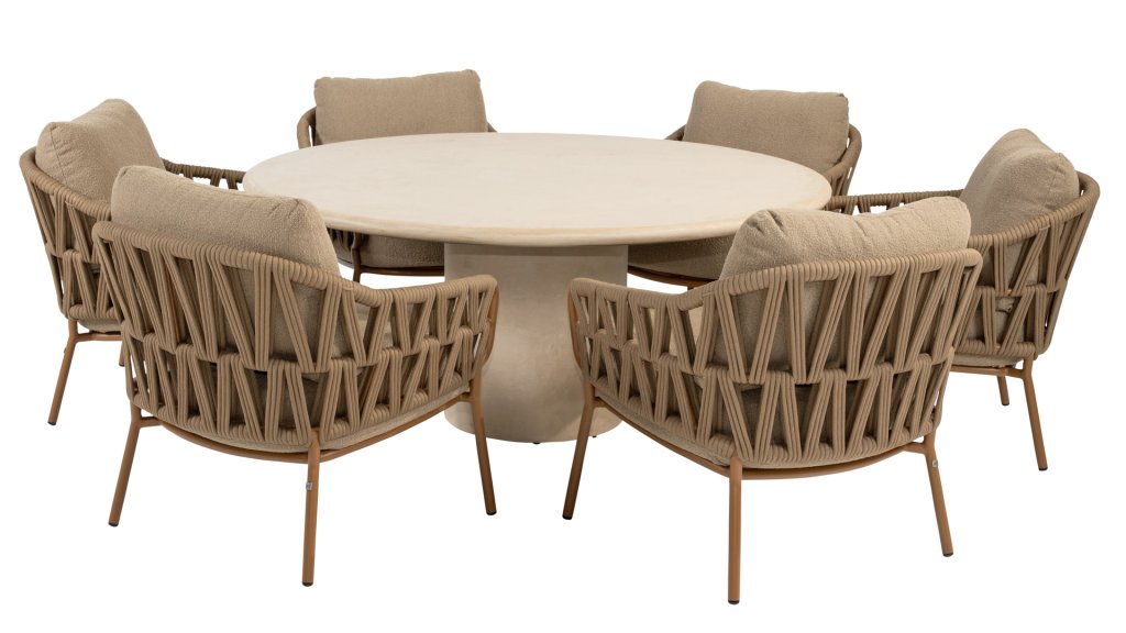 The 4 Seasons Outdoor Biarritz Amber Low Dining set is a perfect choice for any outdoor space. Enjoy both a little bit of lounging and dining in the Biarritz Low Dining set—the best of both worlds. With its generously woven rope details in a deep amber color and the richly filled cushions in a soft, amber bouclé fabric, this set invites ultimate relaxation in your garden or on your patio.