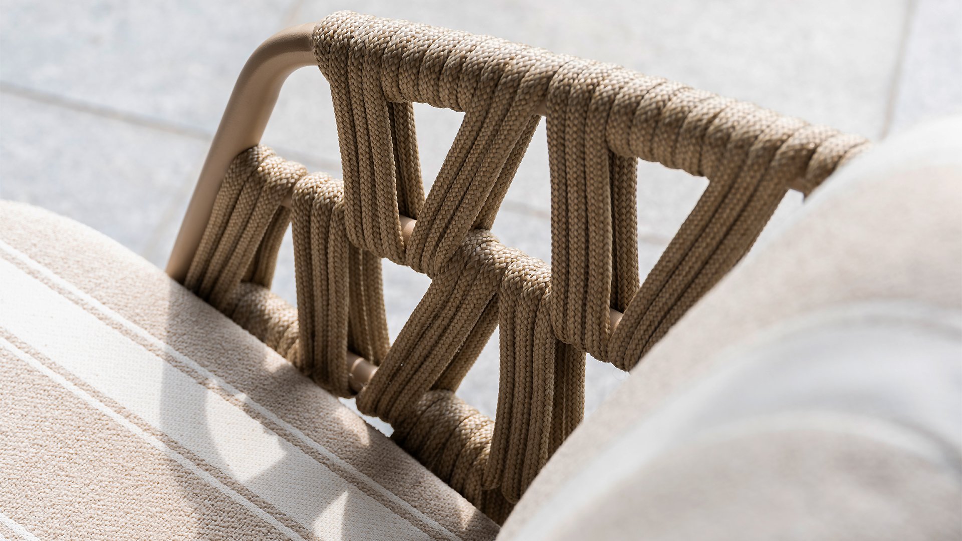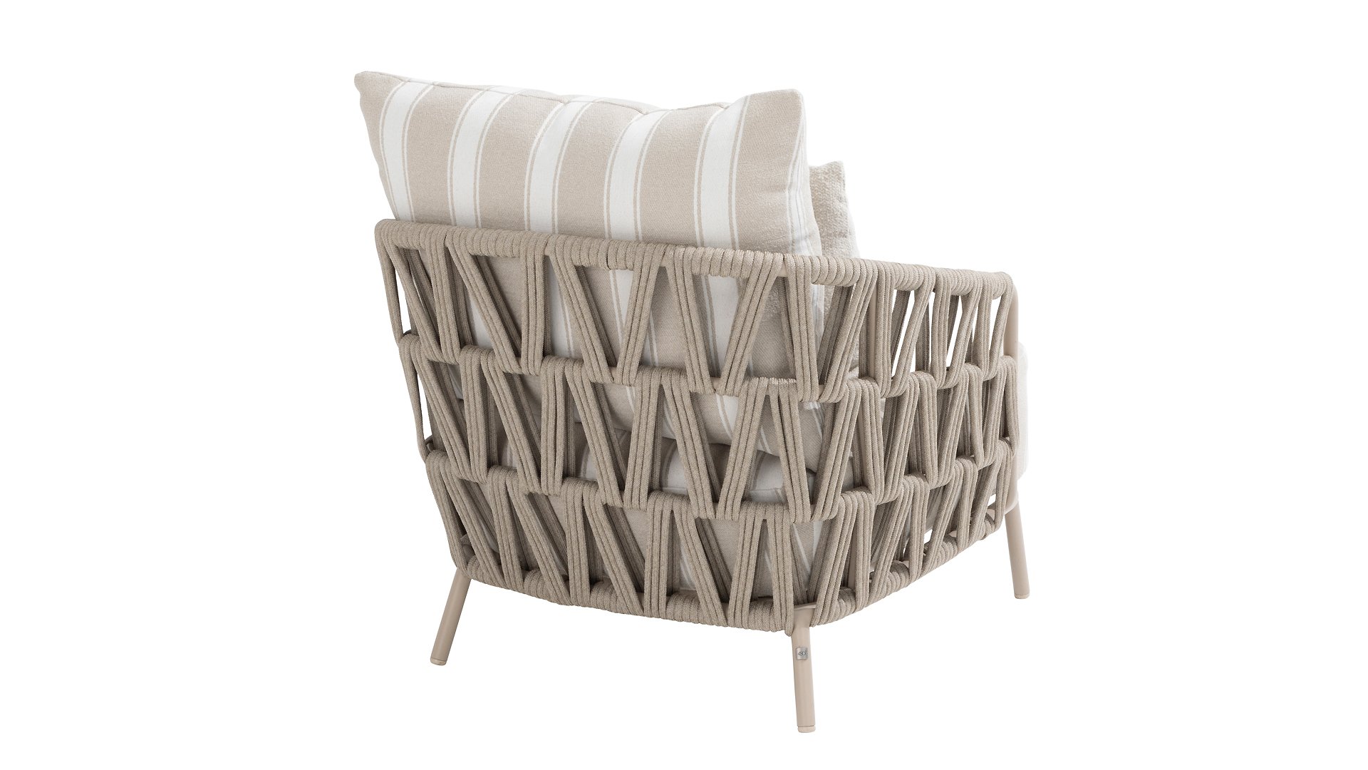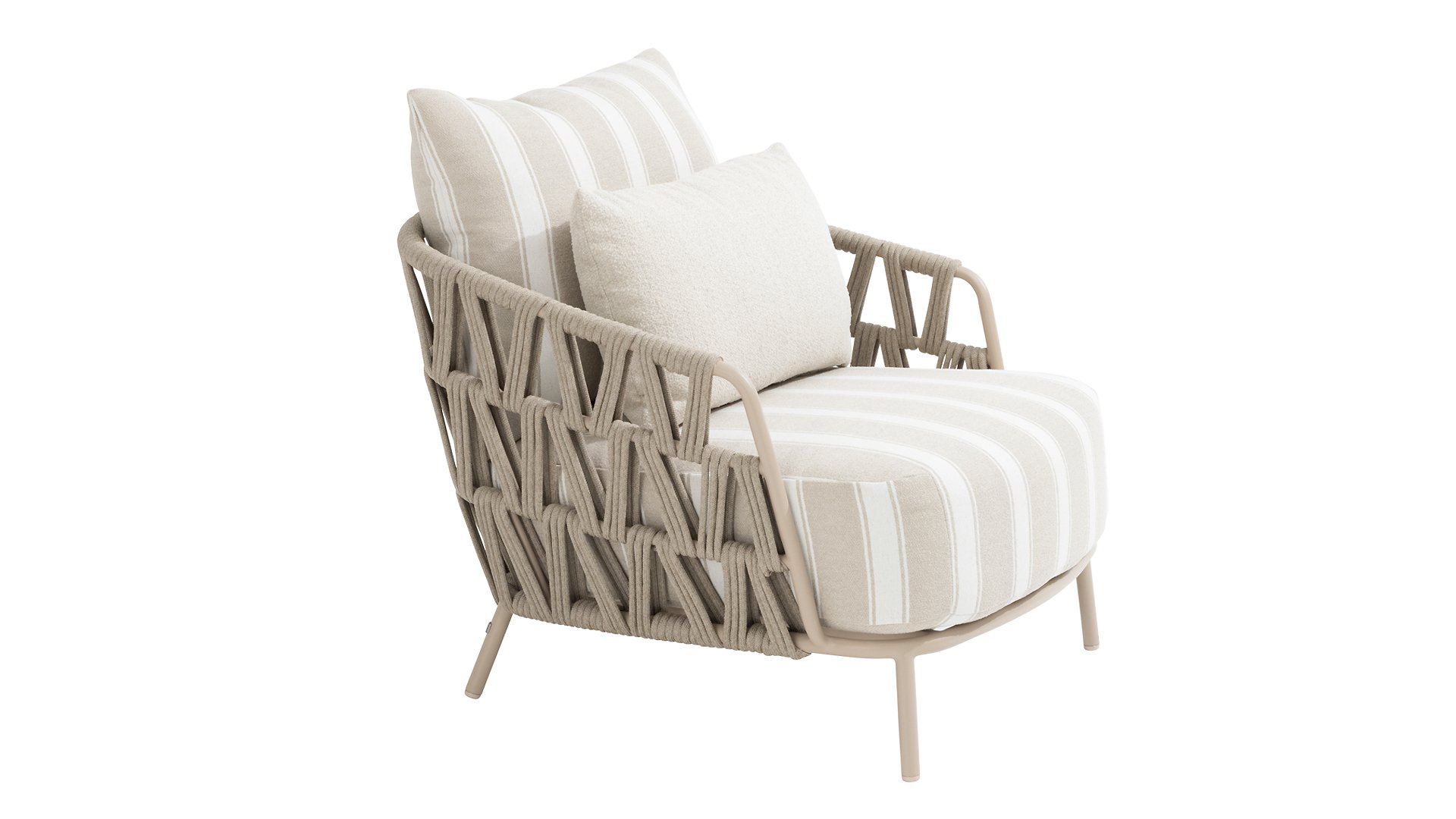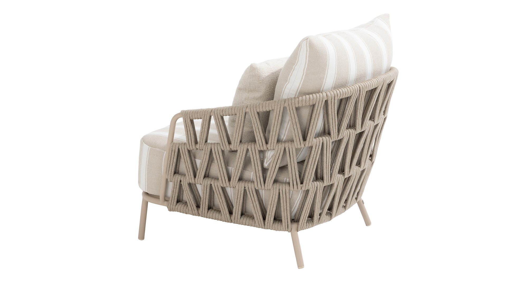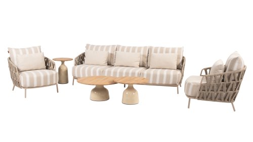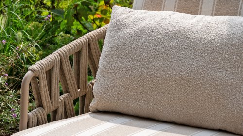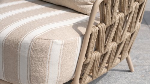 The frame in the elegant Latte color creates a warm, contemporary look, perfect to combine with natural tones and modern outdoor spaces. The thick cushions with a stylish stripe design invite you to relax for hours — whether you're enjoying a good book, a summer drink, or an evening with friends.