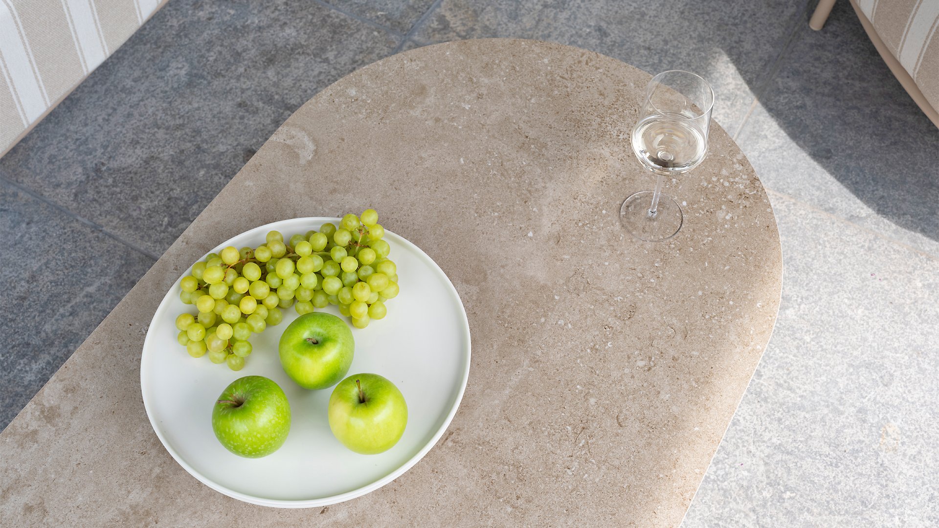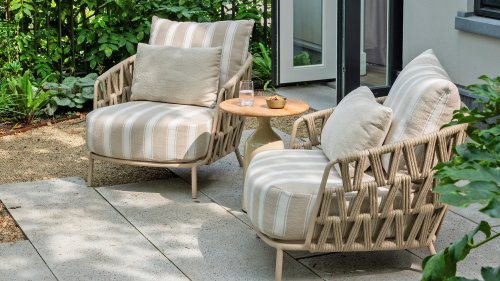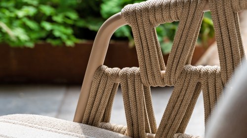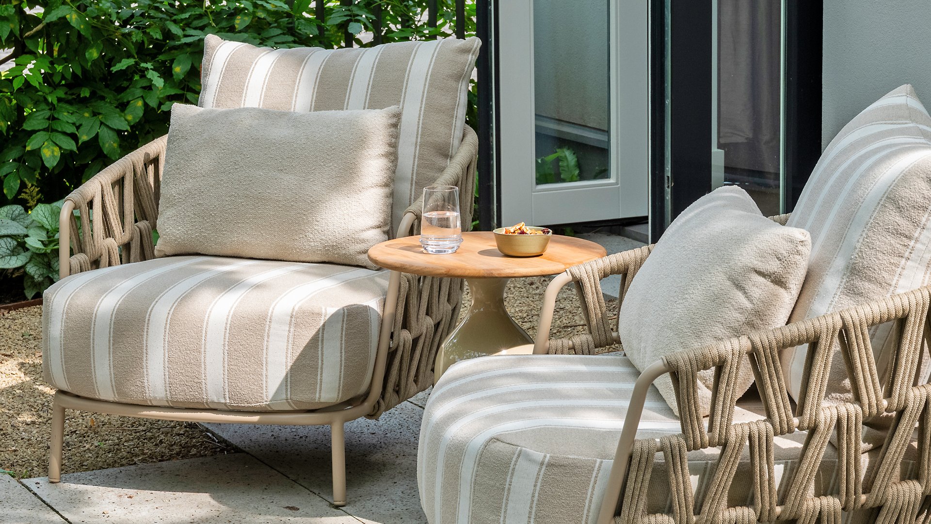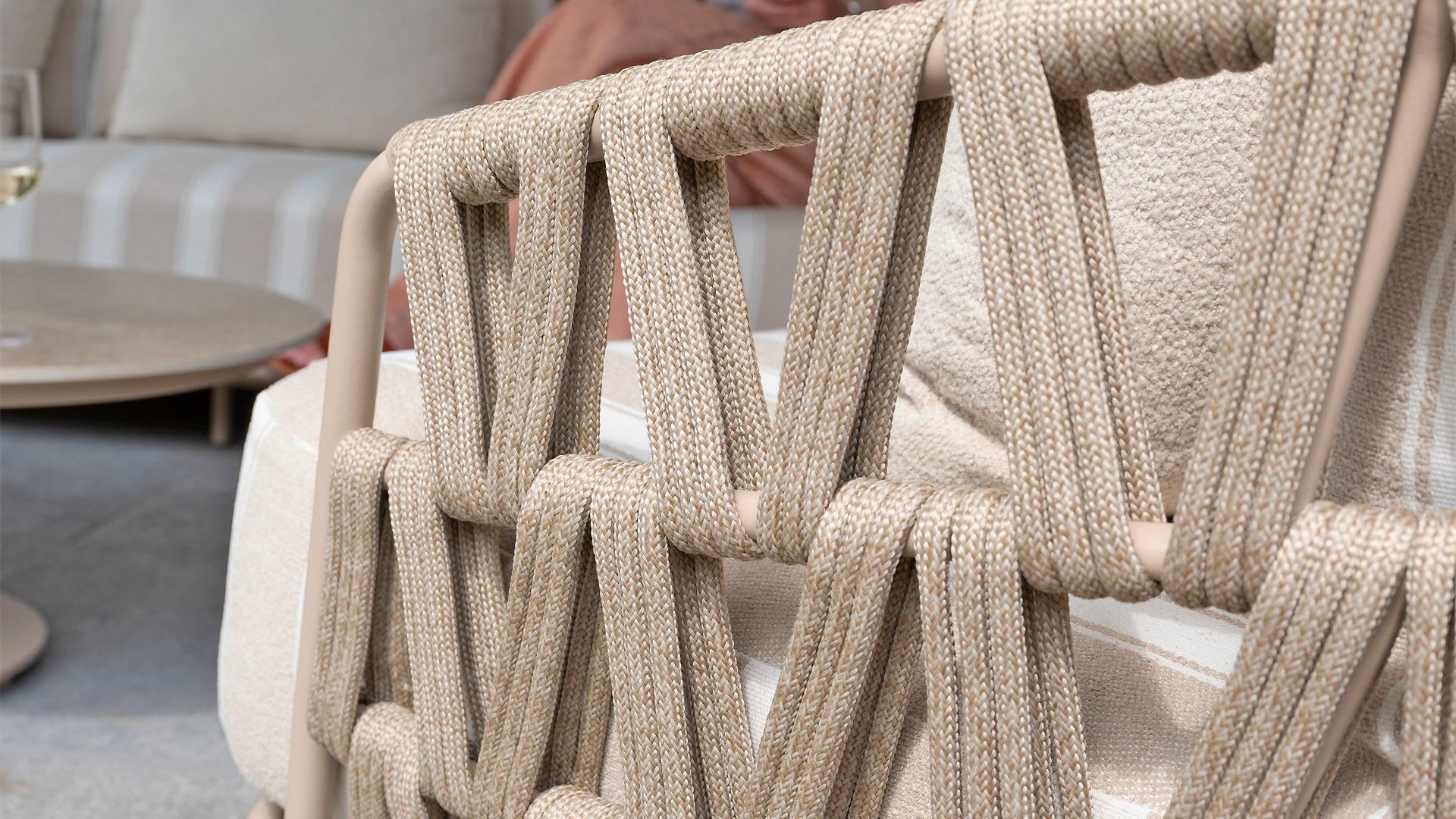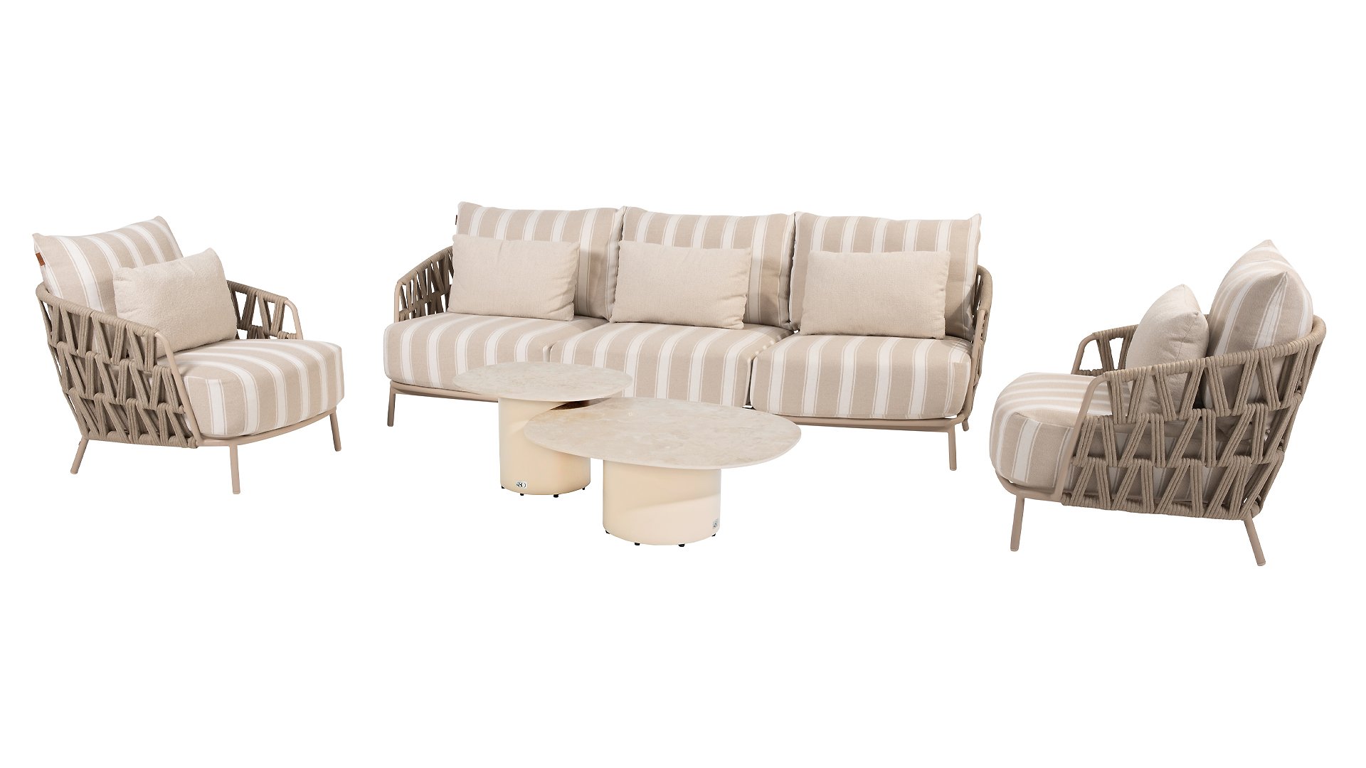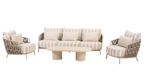 The frame in the elegant Latte color creates a warm, contemporary look, perfect to combine with natural tones and modern outdoor spaces. The thick cushions with a stylish stripe design invite you to relax for hours — whether you're enjoying a good book, a summer drink, or an evening with friends.
