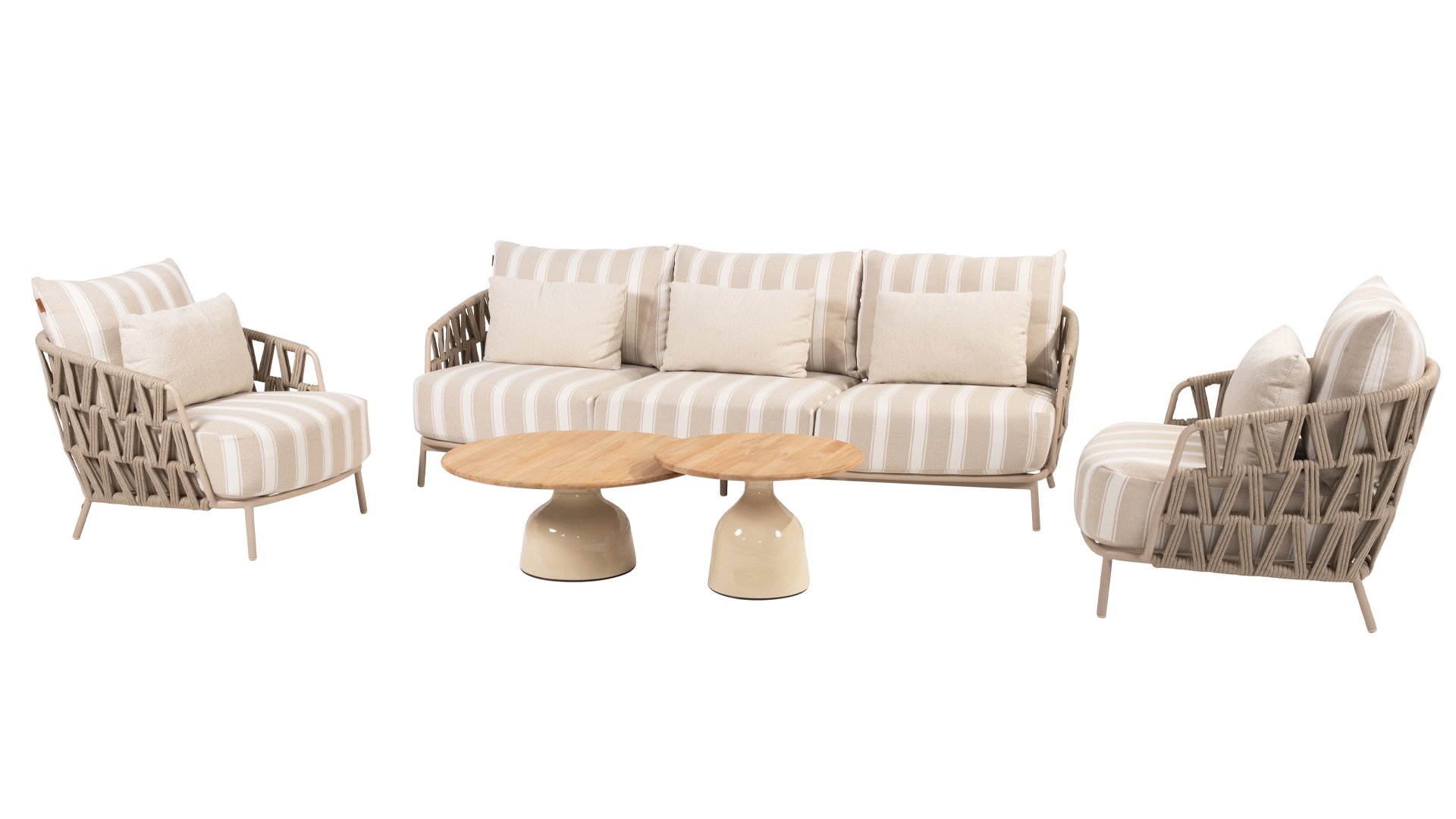 The 4 Seasons Outdoor Beverly is a stylish and comfortable lounge that adds a refined ambiance to your garden, patio, or veranda. With its natural latte-colored Rope finish and soft, boucle-striped cream cushions, this lounge exudes both tranquility and elegance. The design is spacious, inviting, and perfect for long, relaxing moments outdoors.
