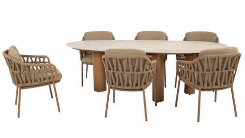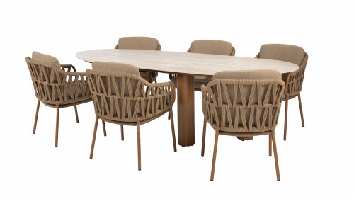 The 4 Seasons Outdoor Biarritz Amber is an elegant and modern lounge collection that exudes warmth and comfort. With its generously woven rope details in a deep amber color and the richly filled cushions in a soft, amber bouclé fabric, this set invites ultimate relaxation in your garden or on your patio.