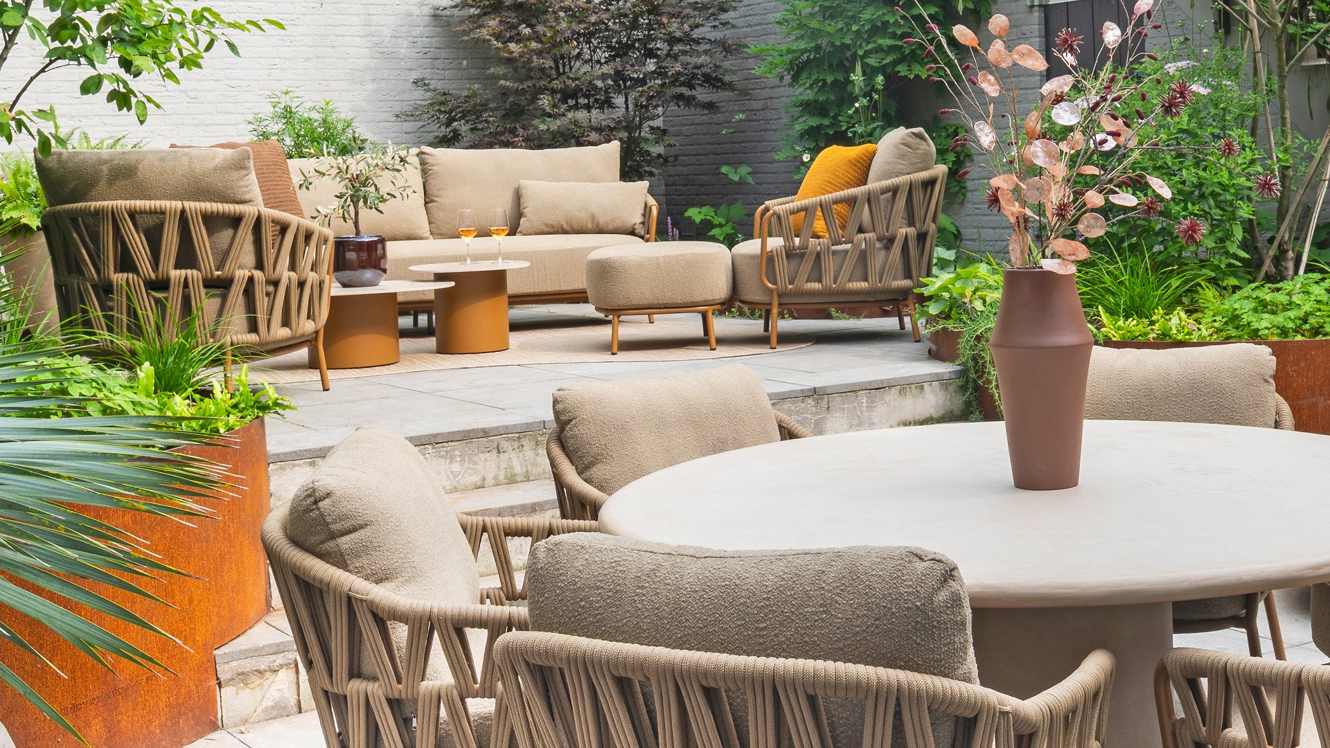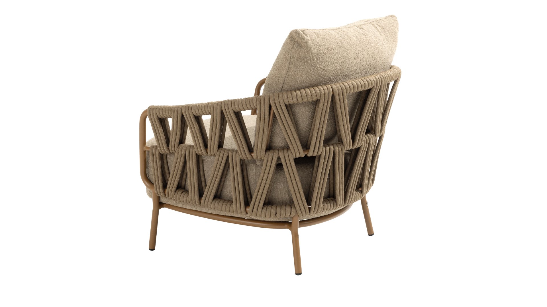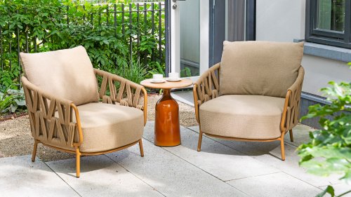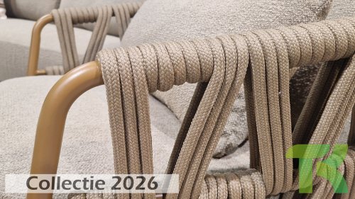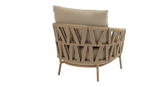 The sturdy frame is crafted from powder-coated aluminum in a warm earth tone, combined with strikingly thick rope wickerwork. This artisanal finish gives the Biarritz series a robust yet refined appearance. The spacious seats, plump cushions, and soft textures make this lounge a luxurious place to spend long summer days.