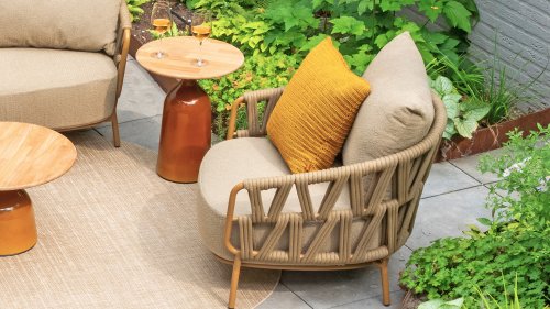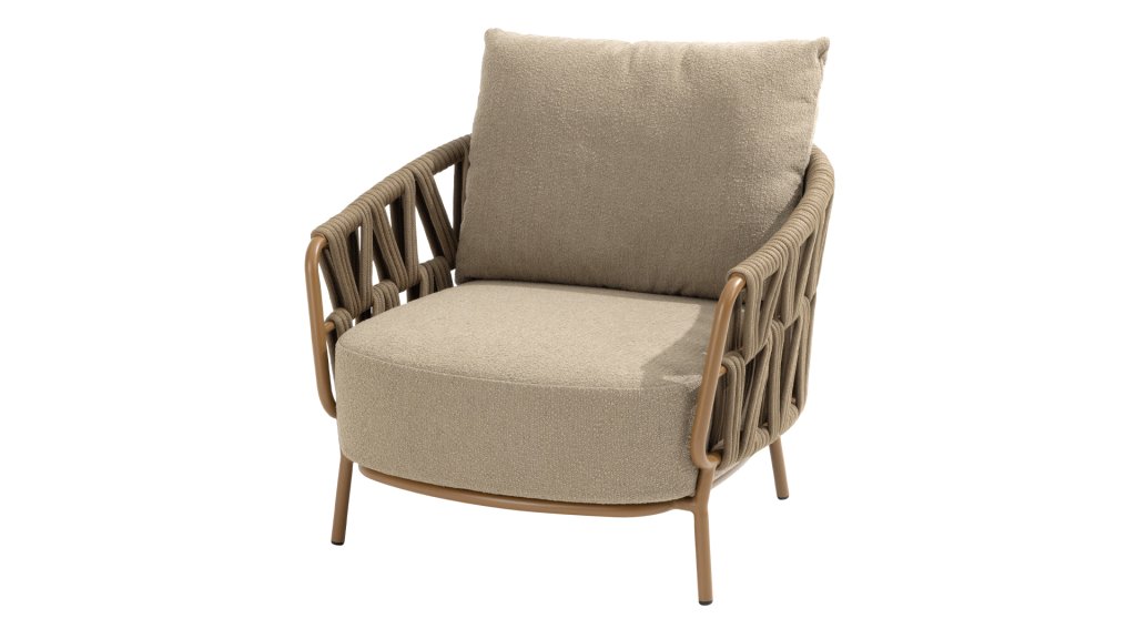 The 4 Seasons Outdoor Biarritz Amber is an elegant and modern lounge collection that exudes warmth and comfort. With its generously woven rope details in a deep amber color and the richly filled cushions in a soft, amber bouclé fabric, this set invites ultimate relaxation in your garden or on your patio.