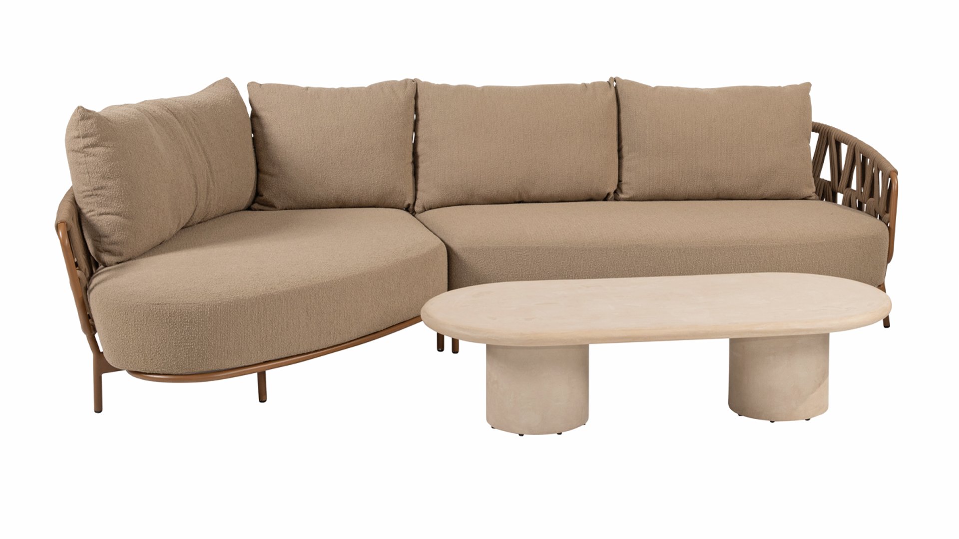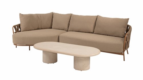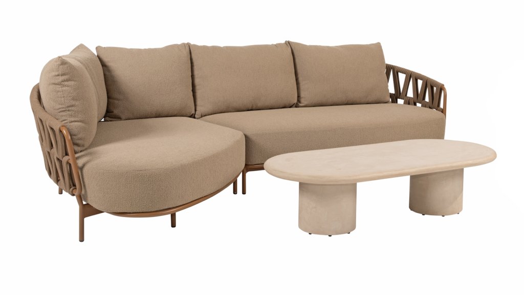 The 4 Seasons Outdoor Biarritz Amber is an elegant and modern lounge collection that exudes warmth and comfort. With its generously woven rope details in a deep amber color and the richly filled cushions in a soft, amber bouclé fabric, this set invites ultimate relaxation in your garden or on your patio.