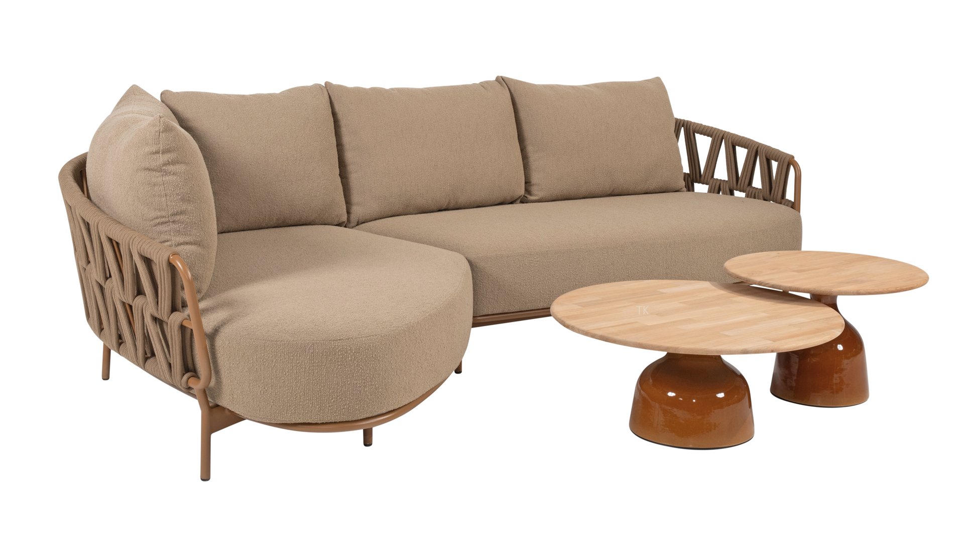 The sturdy frame is crafted from powder-coated aluminum in a warm earth tone, combined with strikingly thick rope wickerwork. This artisanal finish gives the Biarritz series a robust yet refined appearance. The spacious seats, plump cushions, and soft textures make this lounge a luxurious place to spend long summer days.