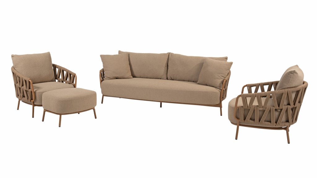 The 4 Seasons Outdoor Biarritz Amber is an elegant and modern lounge collection that exudes warmth and comfort. With its generously woven rope details in a deep amber color and the richly filled cushions in a soft, amber bouclé fabric, this set invites ultimate relaxation in your garden or on your patio.