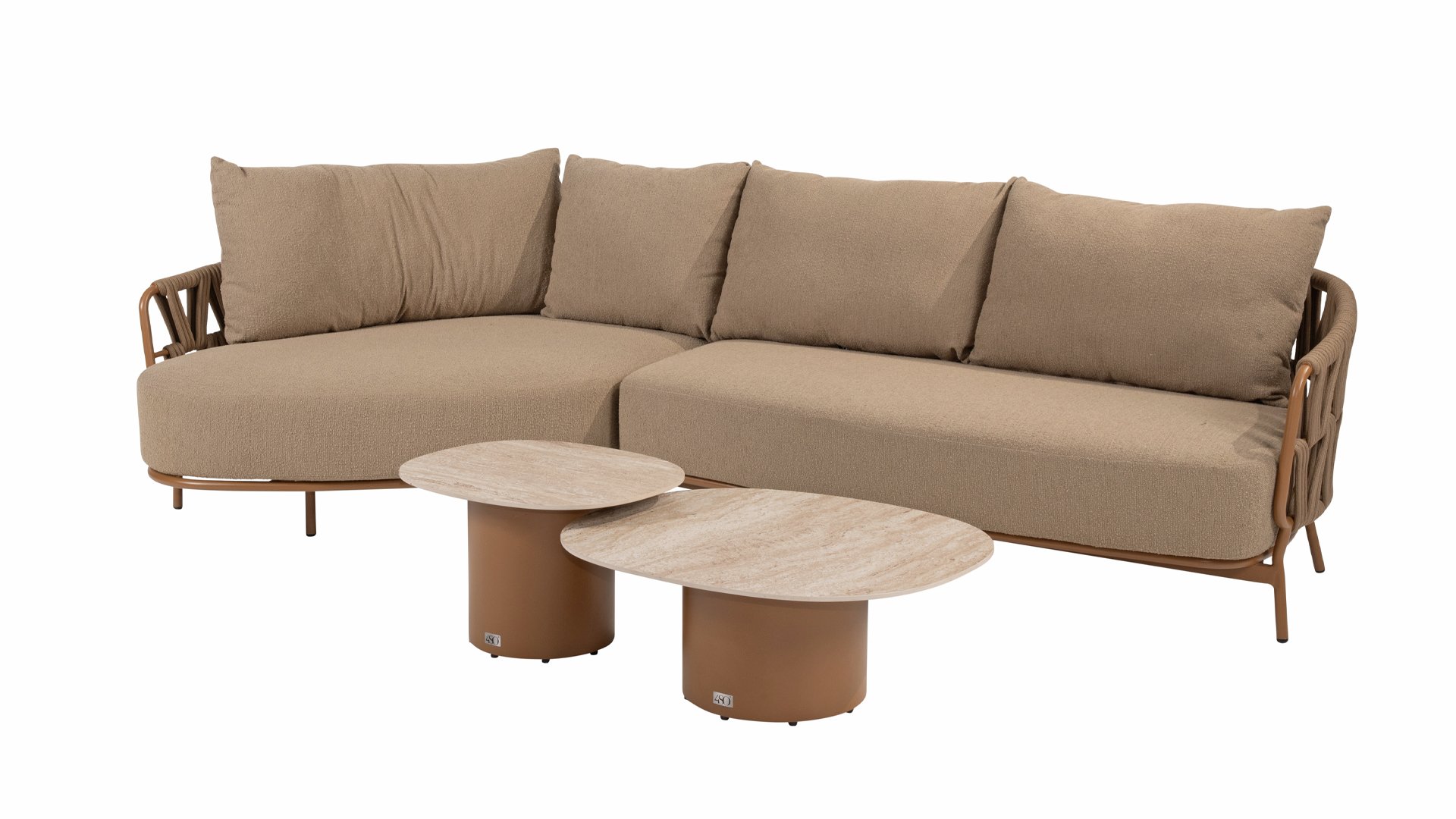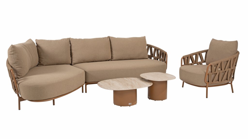 The 4 Seasons Outdoor Biarritz Amber is an elegant and modern lounge collection that exudes warmth and comfort. With its generously woven rope details in a deep amber color and the richly filled cushions in a soft, amber bouclé fabric, this set invites ultimate relaxation in your garden or on your patio.