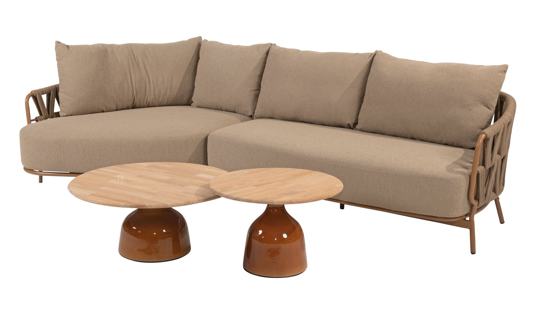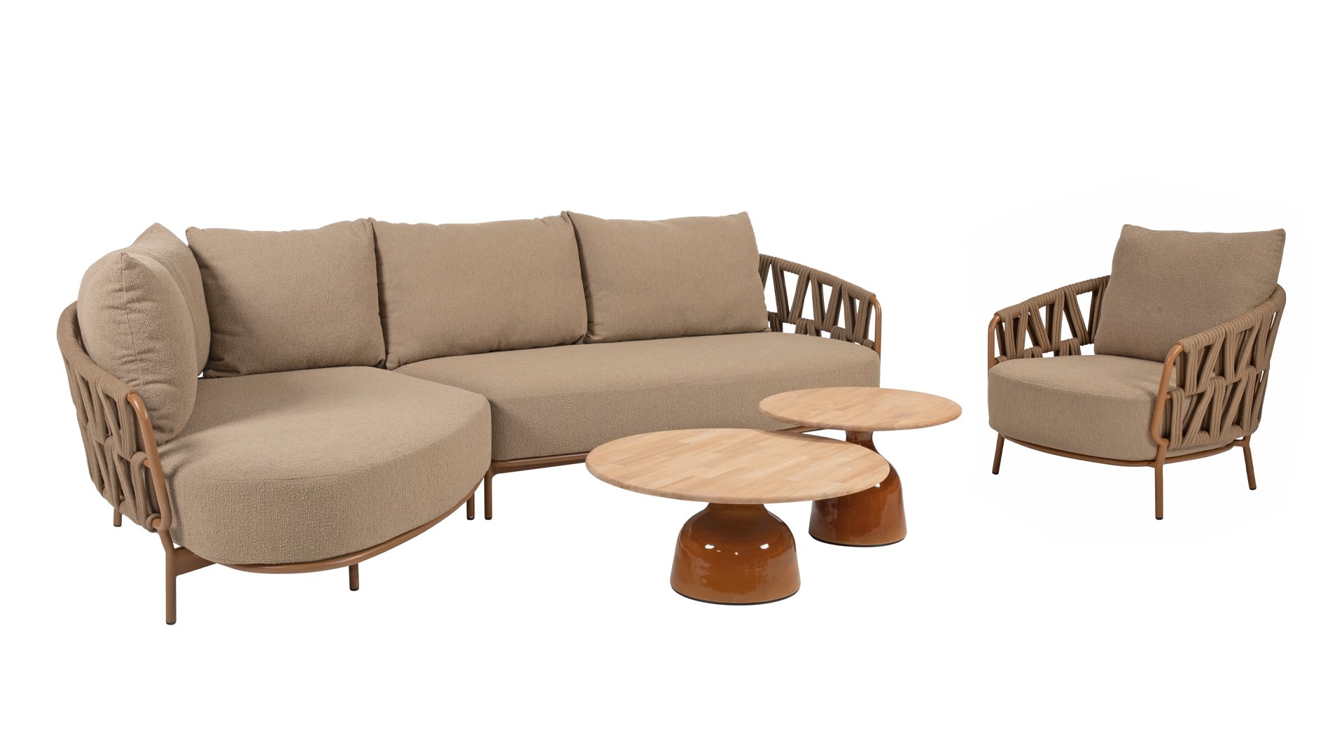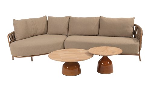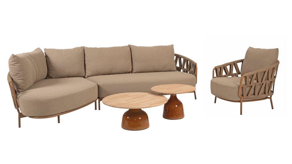 The 4 Seasons Outdoor Biarritz Amber is an elegant and modern lounge collection that exudes warmth and comfort. With its generously woven rope details in a deep amber color and the richly filled cushions in a soft, amber bouclé fabric, this set invites ultimate relaxation in your garden or on your patio.