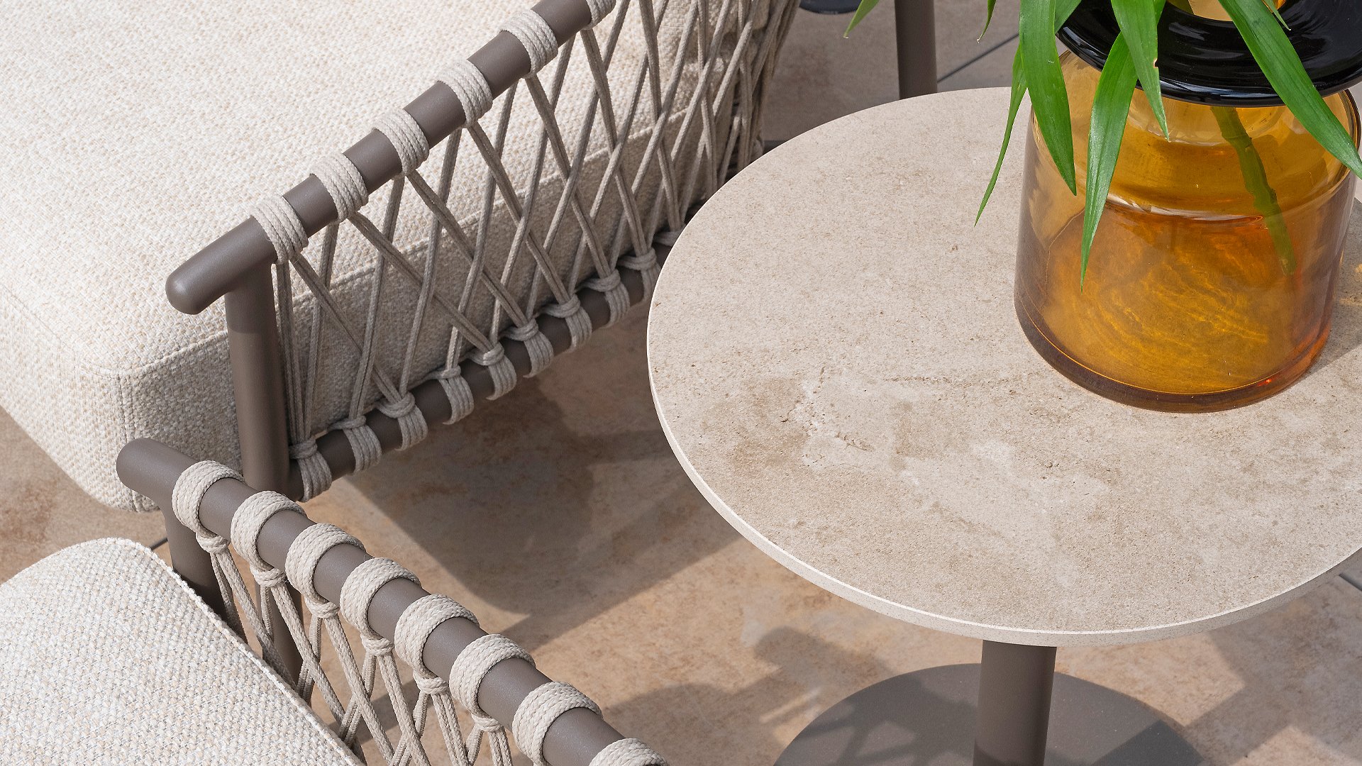 A ceramic top is made of two or three thin layers of ceramic material. Ceramic material is hard-fired and therefore has excellent properties. For normal soiling, simply wipe the top with a damp cloth. Stains can be removed with lukewarm water and green soap, and limescale can be treated with natural vinegar. However, never use harsh abrasives, such as sandpaper, or aggressive agents such as acids and chemicals. Spills of this kind must be removed immediately to prevent irreparable damage. Note: We strongly advise against cleaning your aluminum or ceramic garden furniture with a pressure washer or harsh cleaning agents and/or bleach. These can remove the coating or cause irreparable damage. There is also a risk of discoloration. We advise against covering your furniture for extended periods or covering it with decorations or other items, as this can cause permanent stains or discoloration. Always be careful with fire, oil and grease or hot objects near your furniture as this may cause permanent damage.