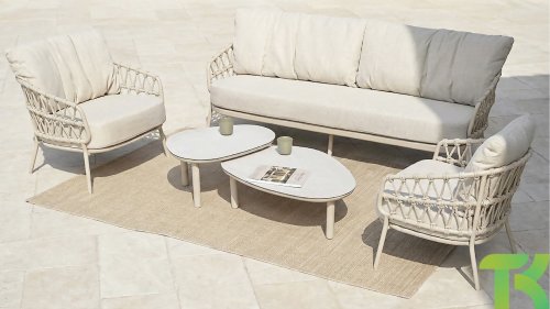 The 4 Seasons Outdoor Calpi series in a new outfit, Latte. Only available at 4 Seasons Outdoor Shop! It has a contemporary design and gives every terrace the premium and warm looks you are looking for. The wide rope parts are woven in an original way, giving the Calpi an open character. The 4Seasons Calpi comes with cushions in an all-weather fabric. This fabric has a water and dirt repellent effect, making it resistant to many weather conditions. The frame is made of powder-coated stainless steel, making the 4SO Calpi Lounge Set very suitable to leave outside all year round.